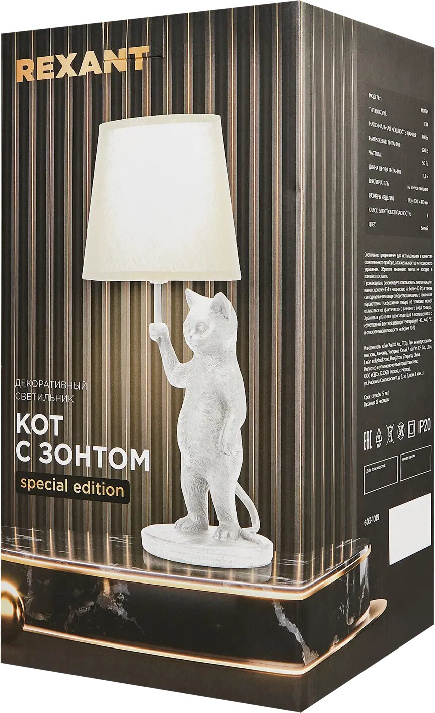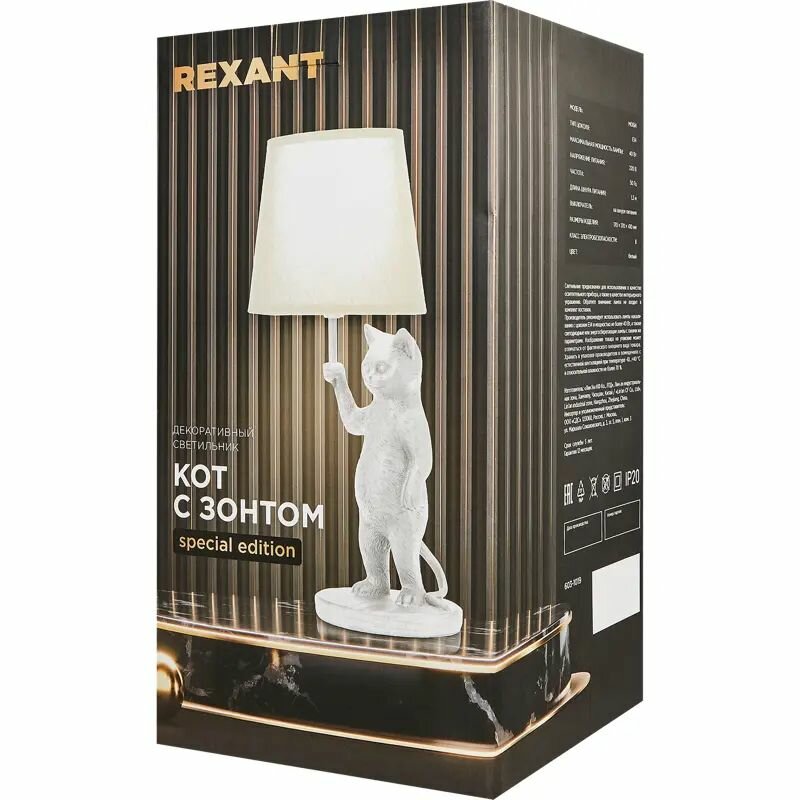 **Настольная лампа Rexant Кот с зонтом** подойдет в качестве дополнительного источника света в гостиной, спальне, прихожей. Модель работает от одной лампочки с цоколем E14, которая не входит в комплект поставки. Максимальная допустимая мощность составляет 40 Вт. Широкое основание не позволяет светильнику переворачиваться.
