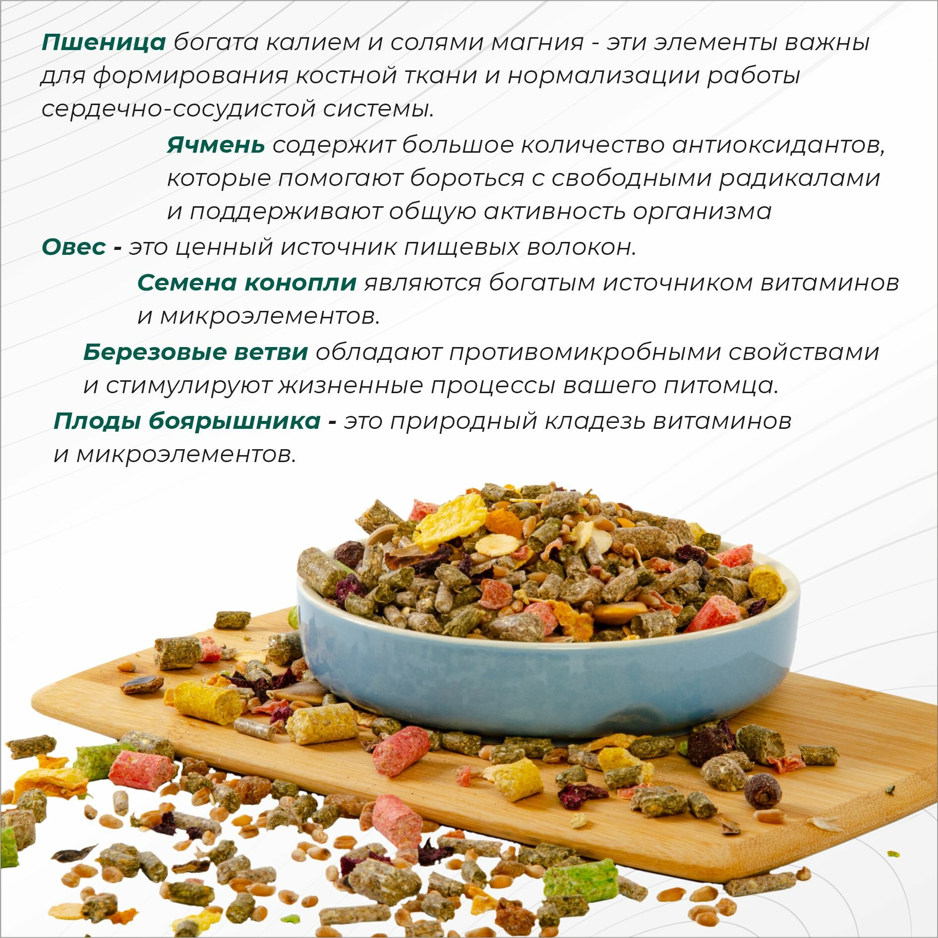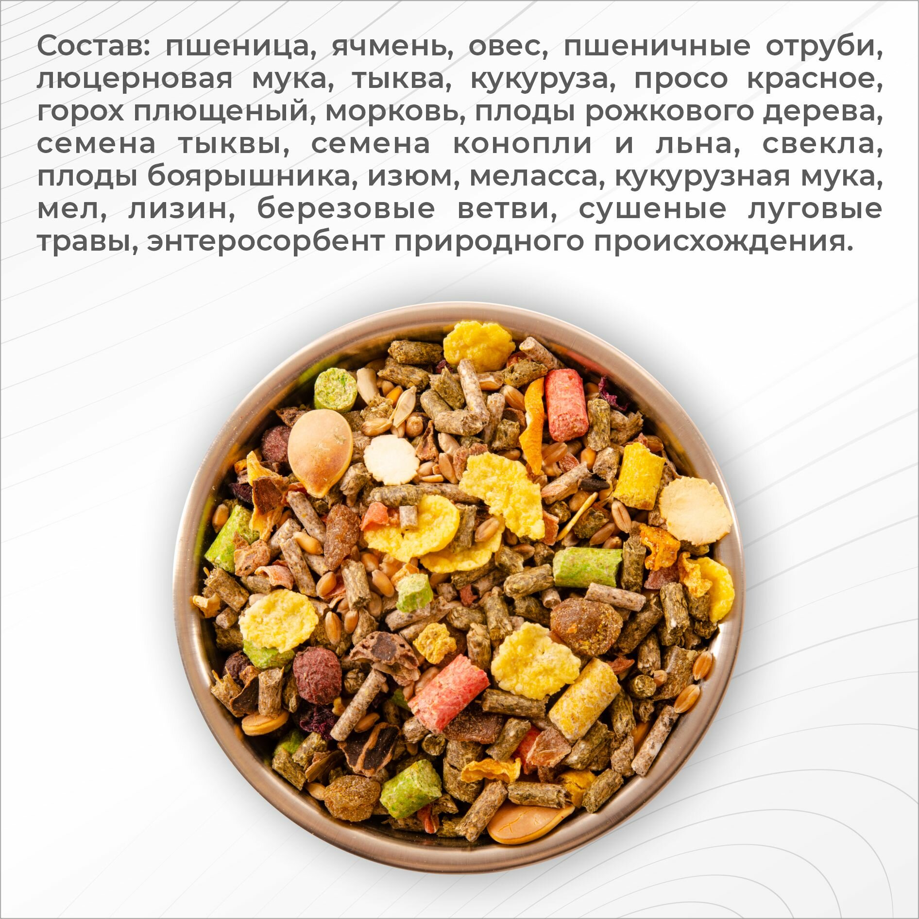 Состав: пшеница, ячмень, овес, пшеничные отруби, люцерновая мука, тыква, кукуруза, просо красное, горох плющеный, морковь, плоды рожкового дерева, семена тыквы, семена конопли и льна, свекла, плоды боярышника, изюм, меласса, кукурузная мука, мел, лизин, березовые ветви, сушеные луговые травы, энтеросорбент природного происхождения.