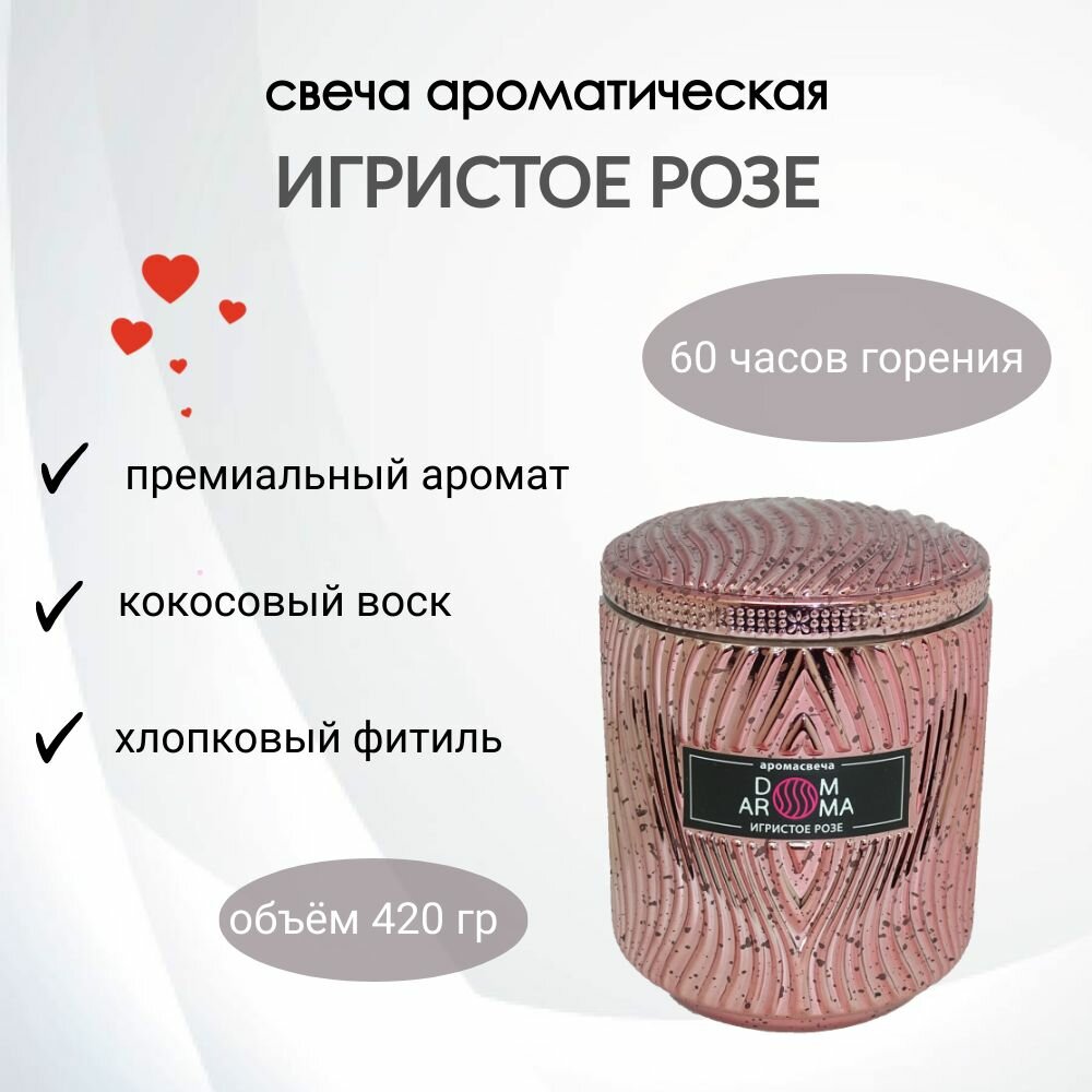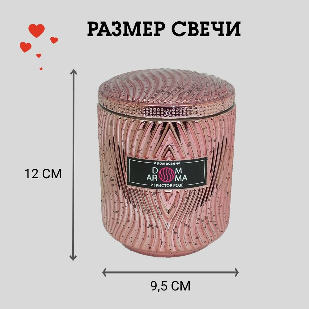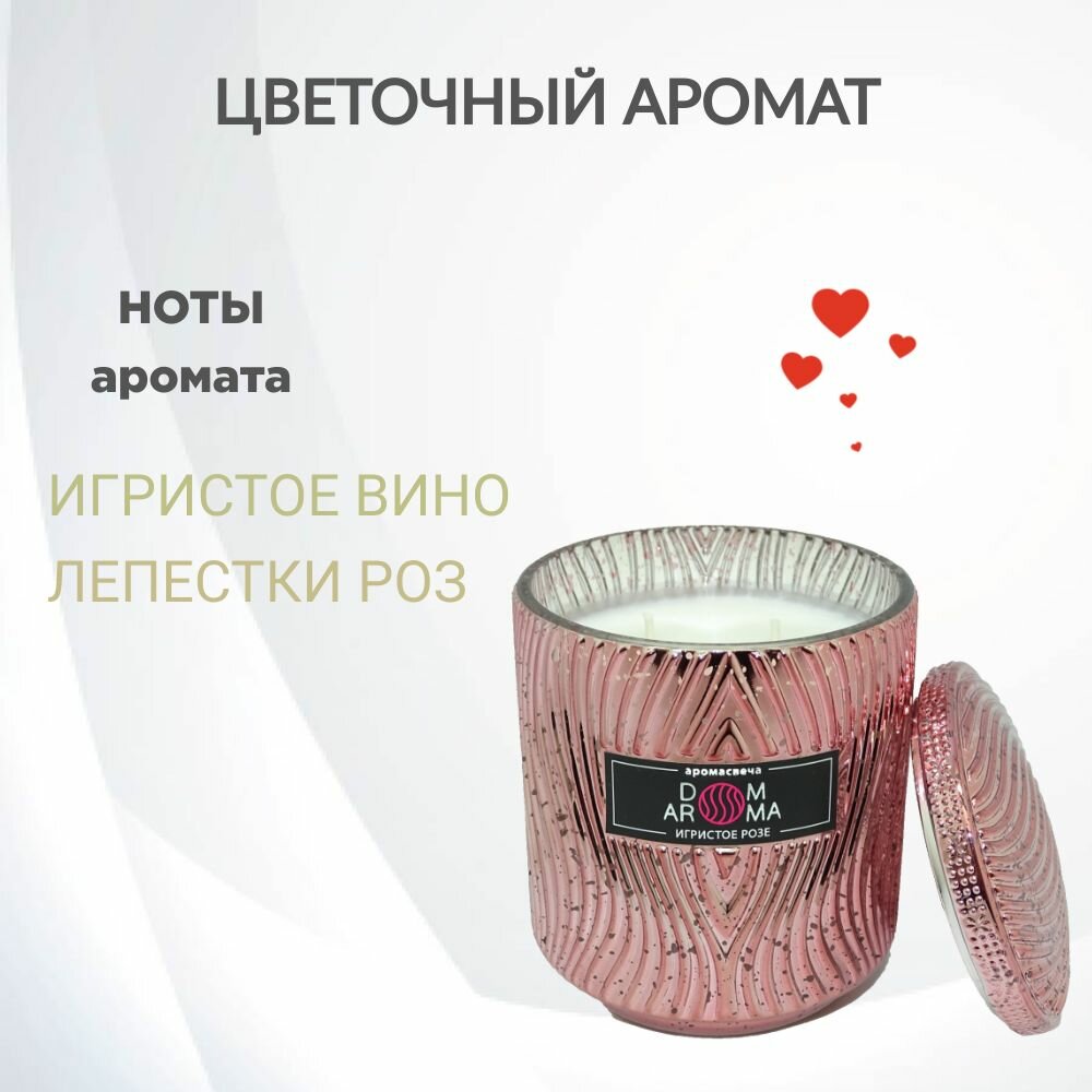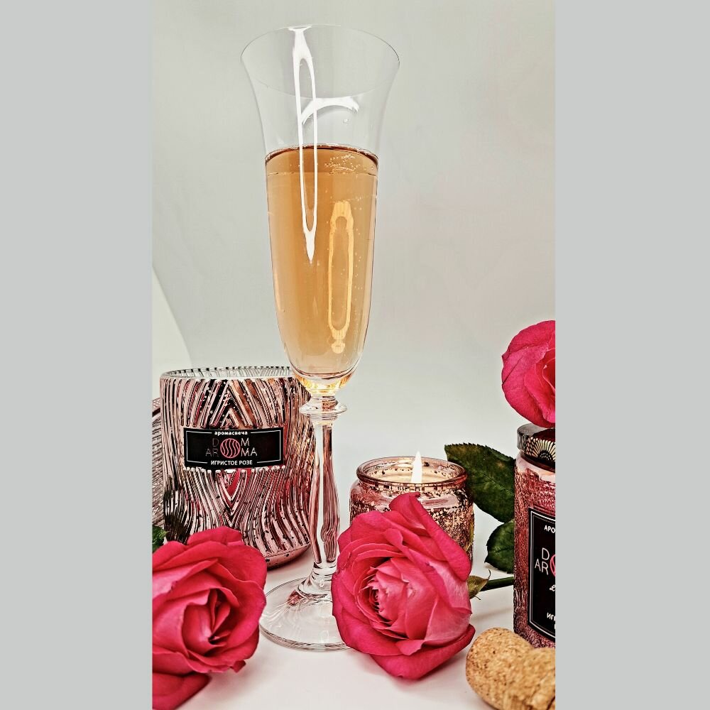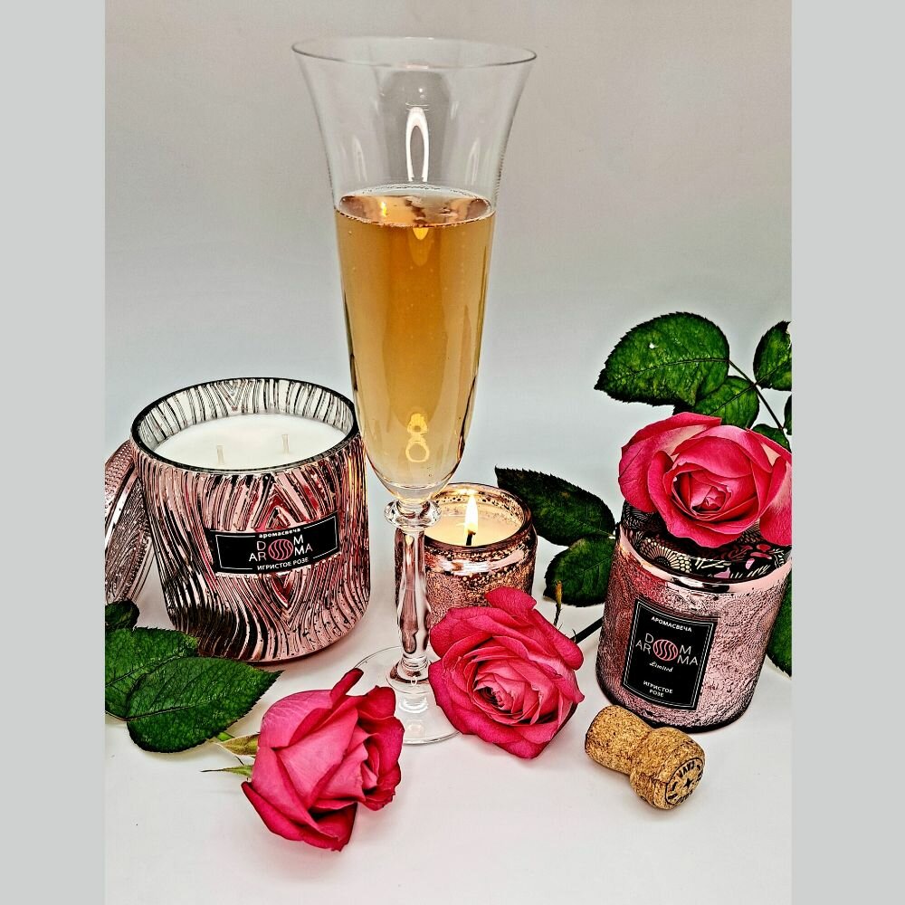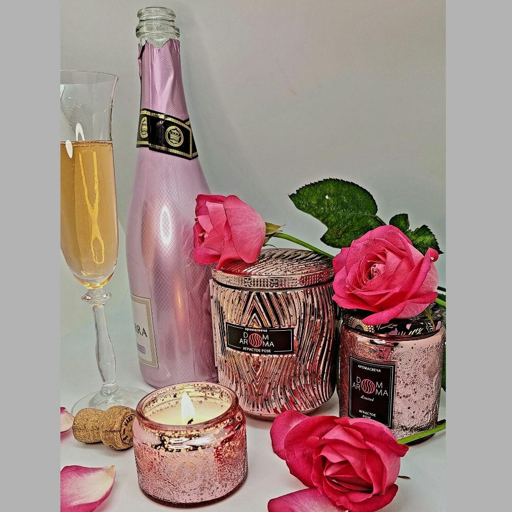 Ароматическая свеча DOM AROMA "Игристое Розе" в стеклянном подсвечнике с крышкой, с 2 фитилями, вес - 420 гр, время горения - 60 часов. Высококачественные ароматические отдушки из Франции отличаются высокой стойкостью и сложностью композиций. Свечи изготовлены из экологически чистого кокосового воска, который идеально подходит для свечей класса люкс, благодаря прекрасному качеству горения и высвобождению большего количества и яркости аромата. Хлопковый фитиль, изготовленный по уникальной технологии, предварительно пропитывается воском, что создает равномерное плавление воска и ровное горение. Подсвечники и флаконы, используемые при изготовлении, являются уникальным дизайнерским предметом интерьера, способным декорировать индивидуальными акцентами любой стиль и обстановку.Шампанское и розы – два символа элегантности, изысканности и роскоши, воплощают в себе аристократический дух, превосходство и утонченность. Аромат шампанского и роз дополняют друг друга, создавая неповторимое сочетание, несущее в себе глубокий смысл и эмоции.Искрящиеся аккорды шампанского, с его легкими и игривыми нотками, наполняет воздух волнующим ароматом и изяществом. Его свежесть и легкость вызывают ощущение летнего бриза, полного радости и оптимизма. Этот аромат является символом праздника, веселья и победы. Он пробуждает в нас чувство восторга и праздничной атмосферы, придавая особую торжественность любому мероприятию. Розы символизируют красоту, соблазн и романтику. Их нежный, опьяняюще-дурманящий аромат пленяет и завораживает. Он восхищает и вдохновляет, придавая особый шарм и чувственность любому пространству. Парфюмерный ансамбль своим свежим насыщенным и многогранным ароматом дополняют друг друга, образуя гармоничное сочетание, которое переносит нас в изысканный мир прекрасного.Шампанское и розы – это воплощение стиля и элегантности, которые всегда будут актуальны, восхищая нас своей красотой и вдохновляя на новые свершения.Благодаря искусной игре теней и света, создаваемых пламенем свечи, оживает декор стеклянного подсвечника.Семейство ароматов: цветочный. Ноты: холодное розовое шампанское брют, лепестки роз.