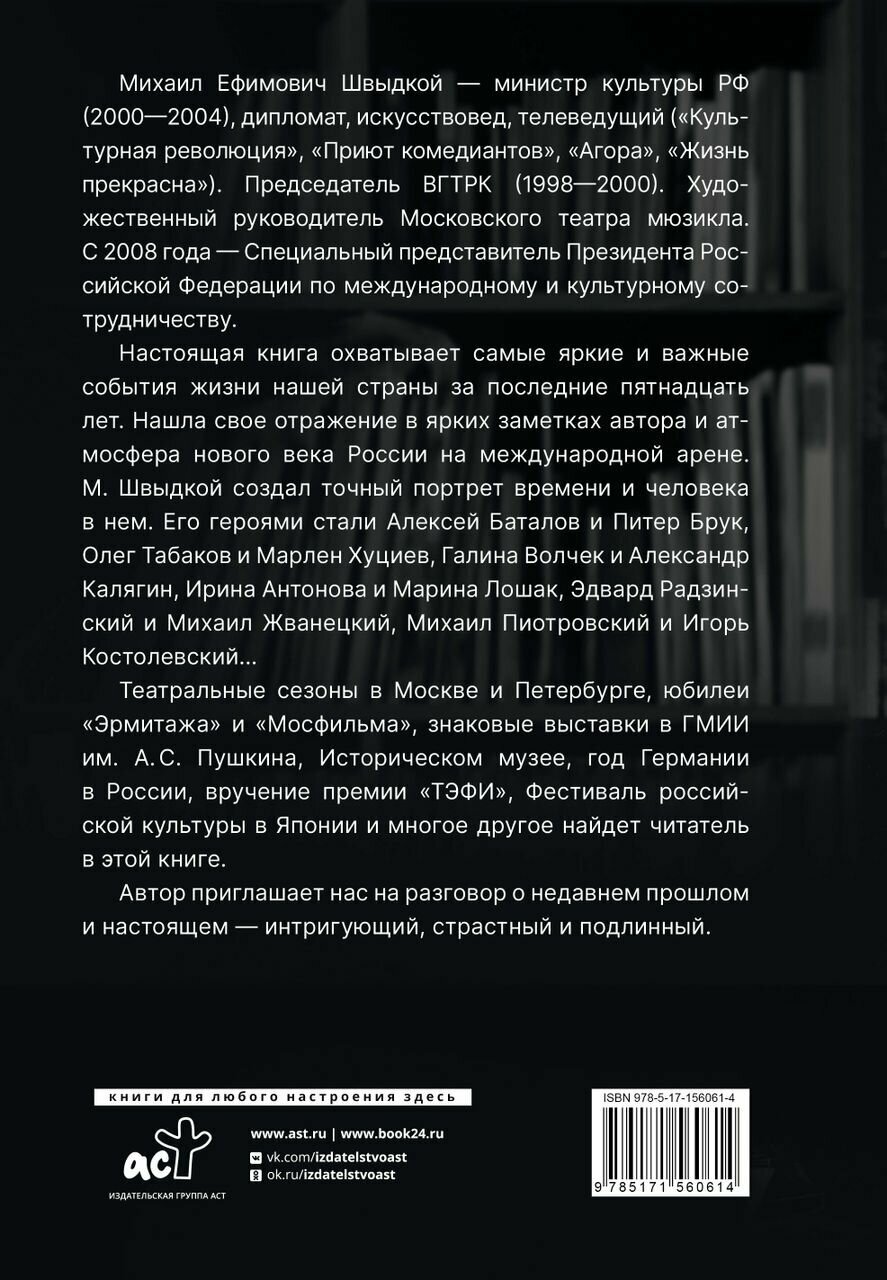 Настоящая книга охватывает самые яркие и важные события жизни нашей страны за последние пятнадцать лет. Нашла свое отражение в ярких заметках автора и атмосфера нового века России на международной арене. М. Швыдкой создал точный портрет времени и человека в нем. Его героями стали Алексей Баталов и Питер Брук, Олег Табаков и Марлен Хуциев, Галина Волчек и Александр Калягин, Ирина Антонова и Марина Лошак, Эдвард Радзинский и Михаил Жванецкий, Михаил Пиотровский и Игорь Костолевский…
