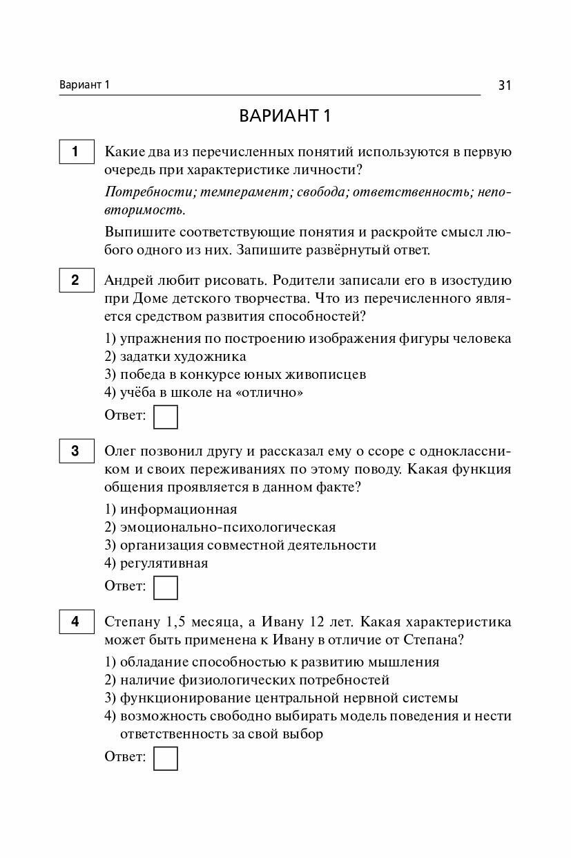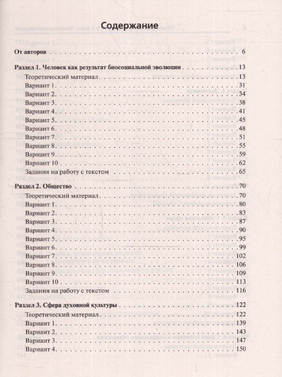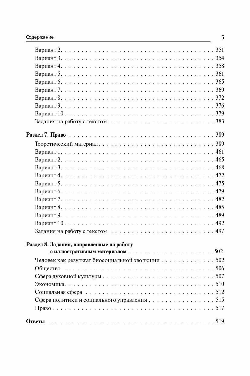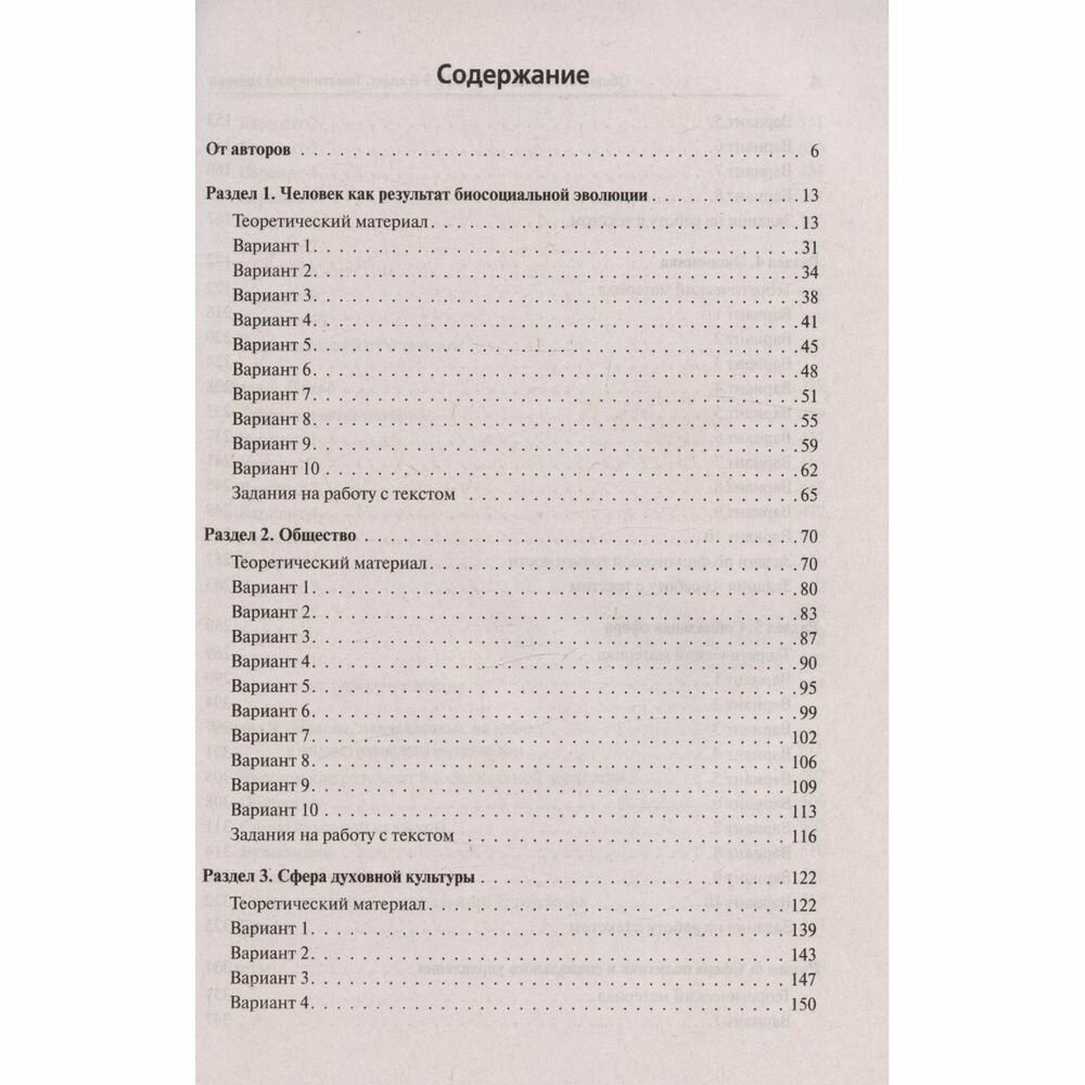 Книга содержит задания по семи тематическим разделам: «Человек как результат биосоциальной эволюции», «Общество», «Сфера духовной культуры», «Экономика», «Социальная сфера», «Сфера политики и социального управления», «Право», а также раздел, посвящённый работе с иллюстративным материалом.