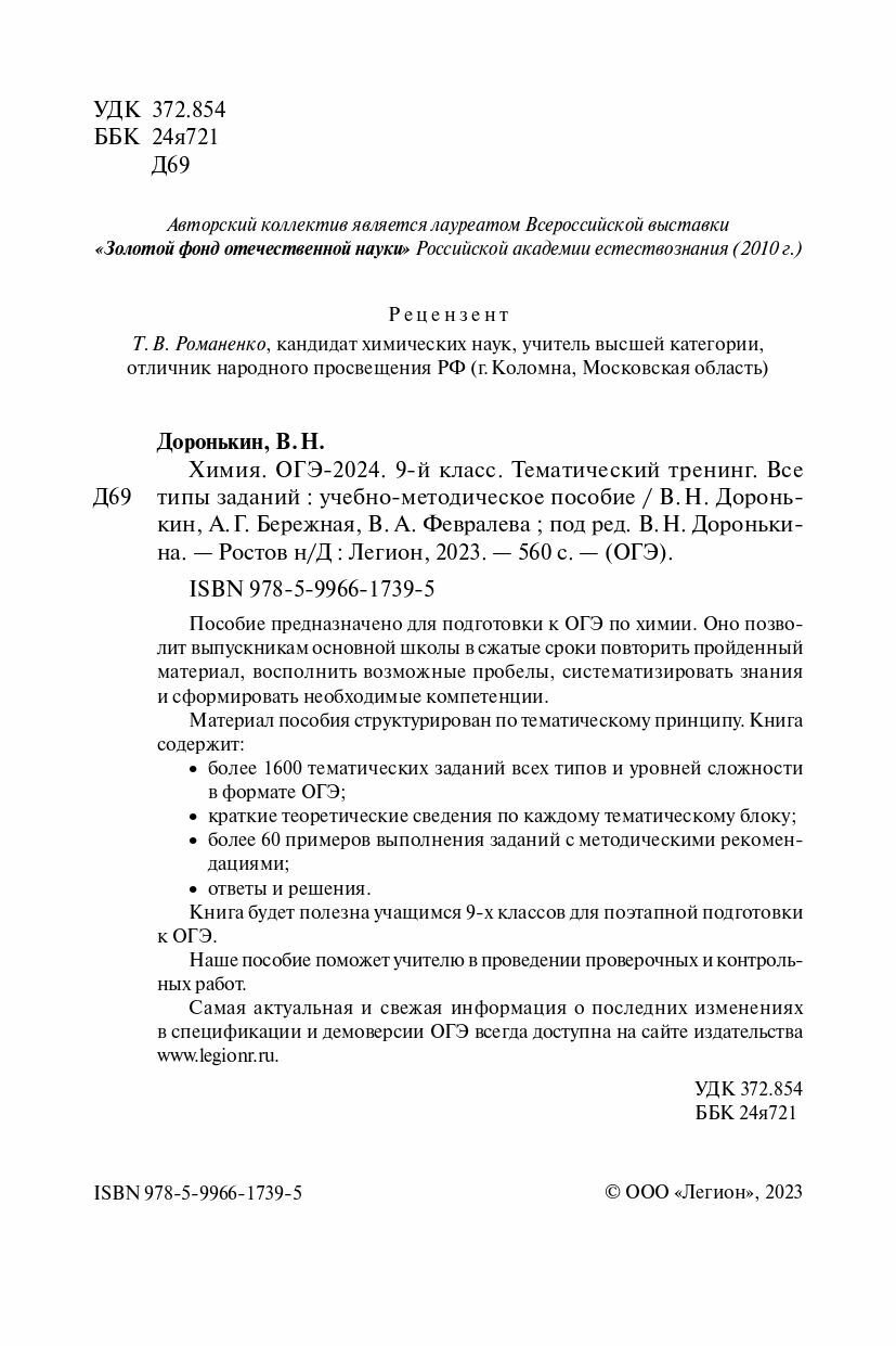 ОГЭ-2024. Химия. 9 класс. Тематический тренинг. Все типы заданий (Доронькин Владимир Николаевич, Февралева Валентина Александровна, Бережная Александра Григорьевна); Легион, 2023