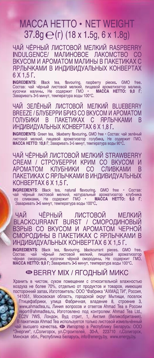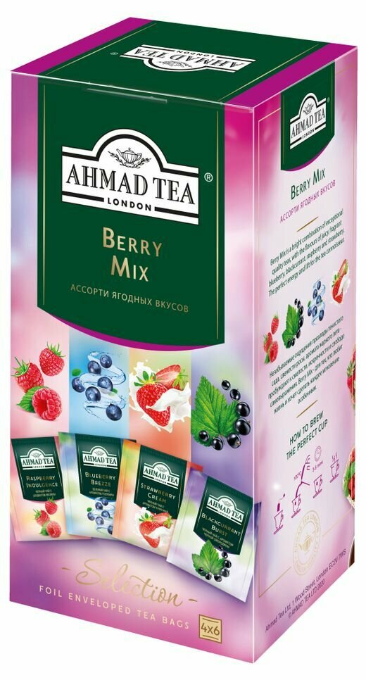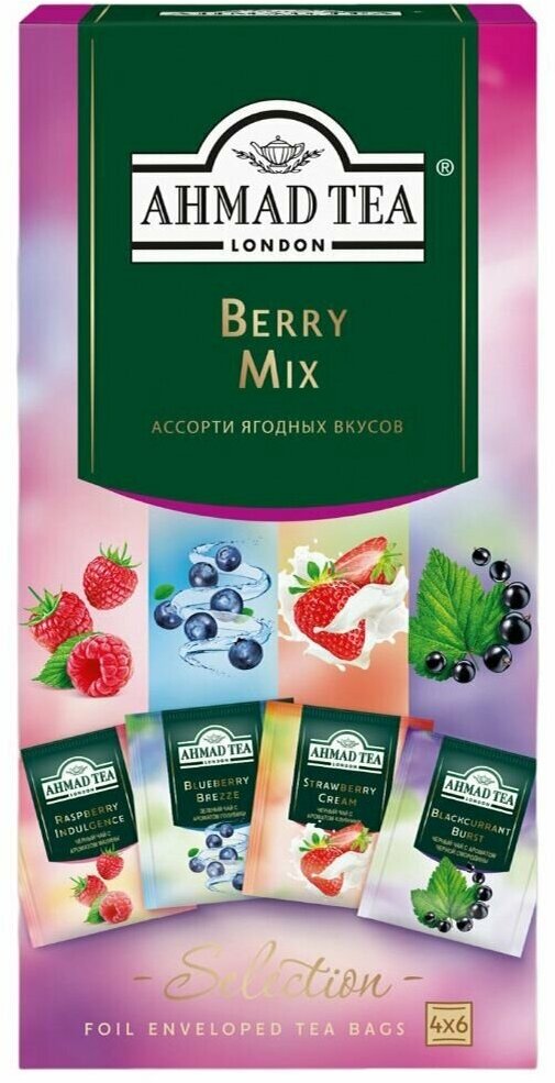 Ягодный микс Berry Mix - новинка Ahmad Tea, яркая композиция изысканных вкусов черного и зеленого чая Ahmad Tea с ароматами ягод. Зарядиться энергией и ощутить прилив сил, отвлечься от суеты и освежить взгляд на привычные вещи, насладиться домашним уютом и сделать общение с другом еще более душевным, - в ассорти вы найдете тот самый купаж, который сделает мгновение вашей жизни особенным! Почувствуй яркость сочных вкусов чая Ahmad Tea! Набор чая из 4 вкусов (по 6 чайных пакетиков каждого вкуса в индивидуальном конверте): Смородиновый Взрыв (черный ароматизированный чай), Малиновое Лакомство (черный ароматизированный чай), Строуберри Крим (черный ароматизированный чай), Блуберри Бриз (зеленый ароматизированный чай)