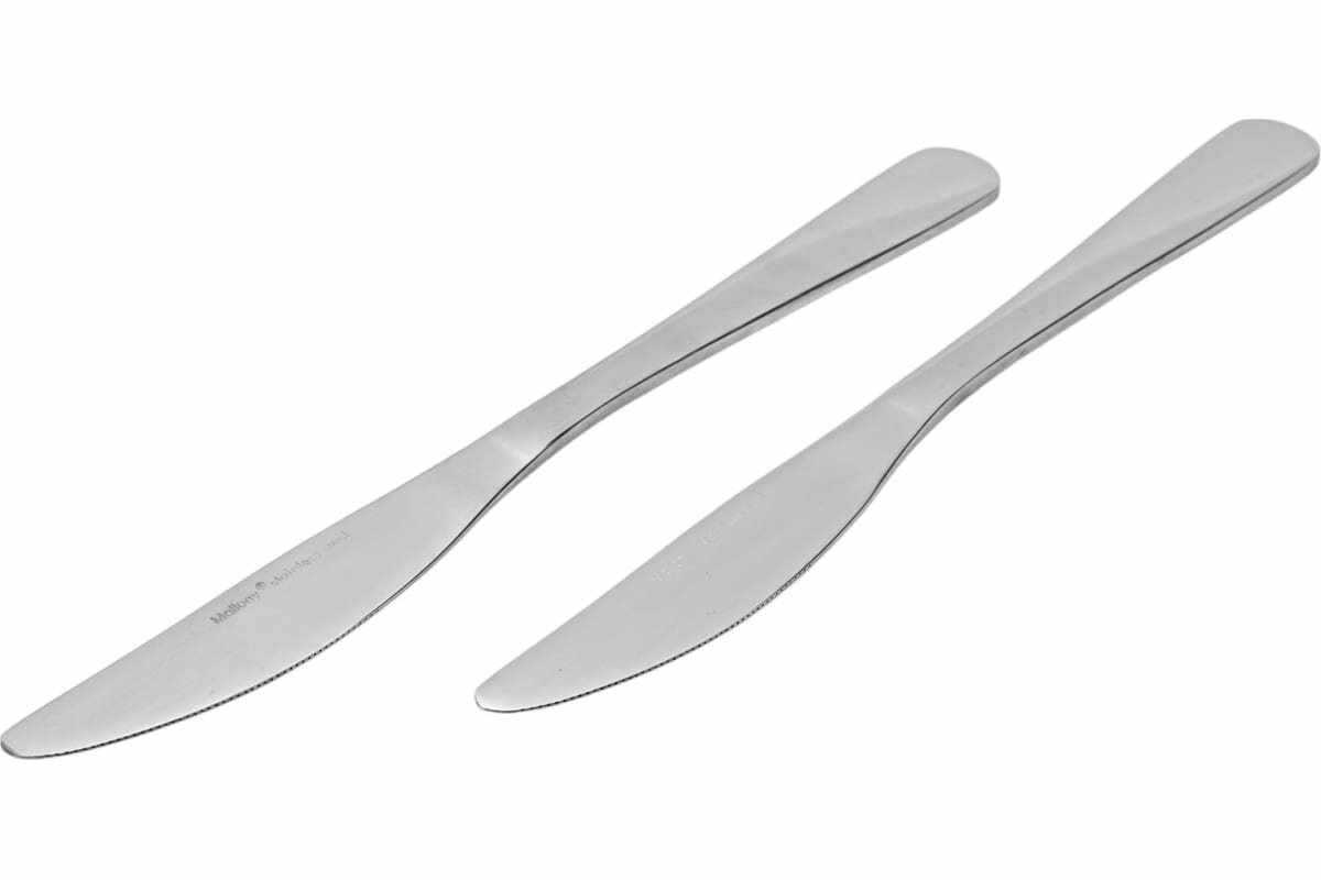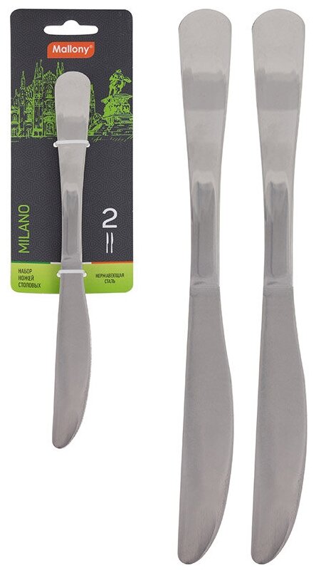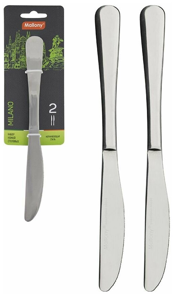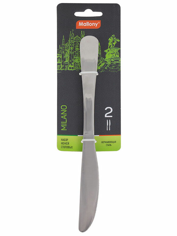 Цена за 1 шт. Нож столовый Mallony Milano, 225 мм, набор 2 шт Преимущества: - Высокое качество столовых приборов во многом определяет впечатление от блюд на столе; - Изготовлены из нержавеющей стали, которая не окисляется и не портит вкус продуктов; - Зеркальная полировка. Предназначен для сервировки, использования за столом. Материал: нержавеющая сталь; Длина: 225 мм; Ширина: 20 мм; Толщина стали: 3 мм; Количество: 2 шт.