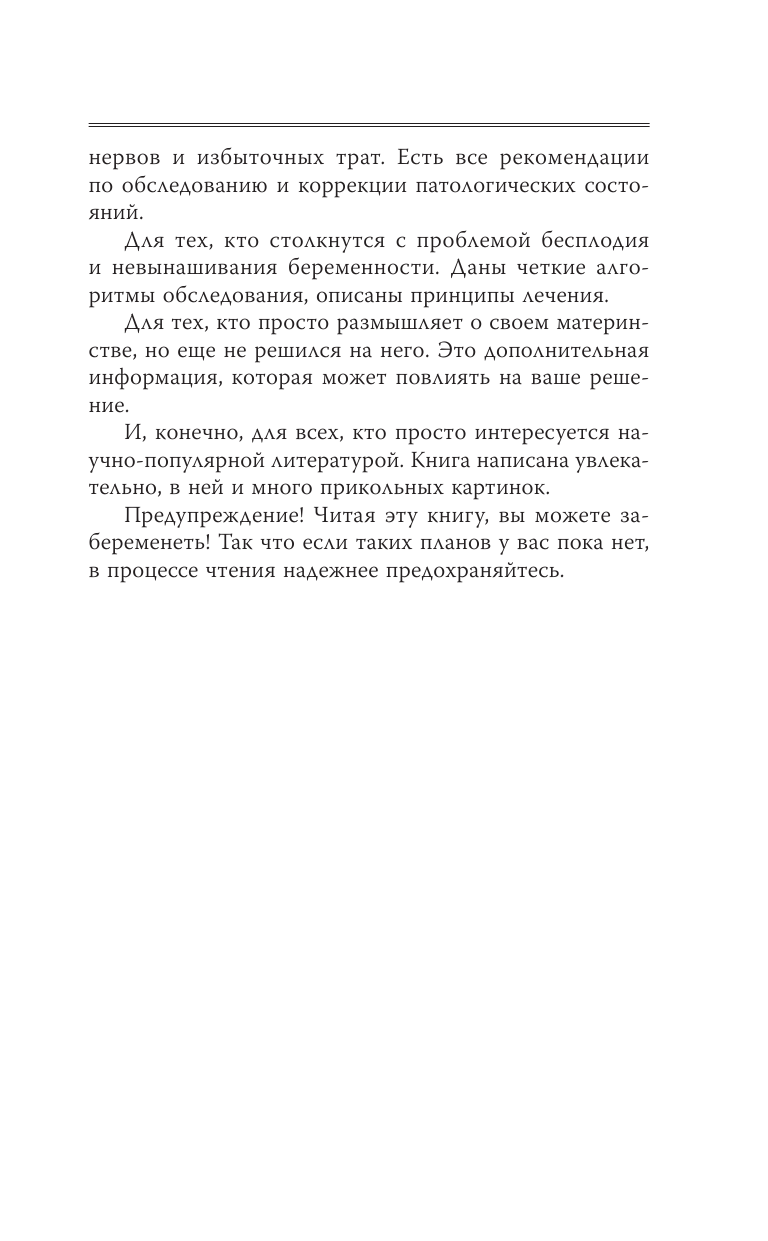 Автор легко и понятно рассказывает о нюансах зачатия ребенка и причинах «задержек» в этом процессе, дает полноценные алгоритмы по нужным обследованиям и развенчивает популярные мифы, на которых зарабатывает медицинская индустрия.