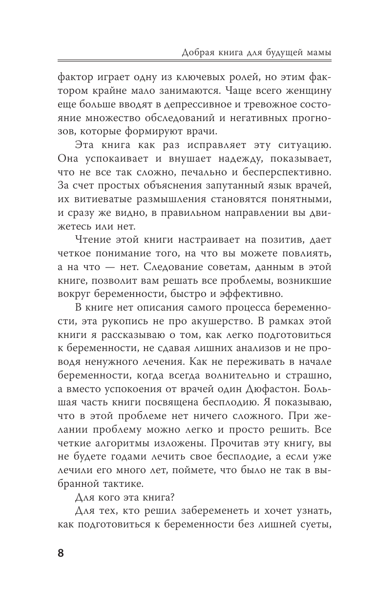 Книга \"Добрая книга будущей мамы\" - это настоящий сокровищница знаний о беременности. Я чувствую, что теперь я знаю все, что нужно знать о том, как забеременеть и как подготовиться к этому важному моменту в жизни. Автор очень легко и понятно объясняет все нюансы, связанные с беременностью, и я действительно чувствую, что полностью готова к этому новому этапу в жизни как марально, так и физически.