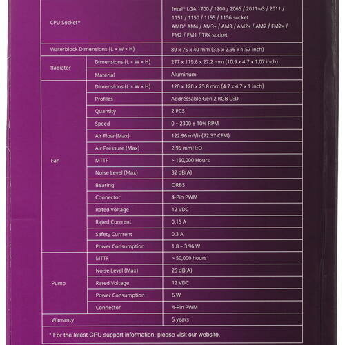 Система охлаждения/ Cooler Master (240W, 240mm, ARGB, fans:2x120mm/72.37CFM/32dBa/2300rpm, 1700/1200/115X/2066/2011-V3/2011/AM5/AM4/AM3/AM3+/AM2/AM2+/FM2/FM2+/FM1/TR4)