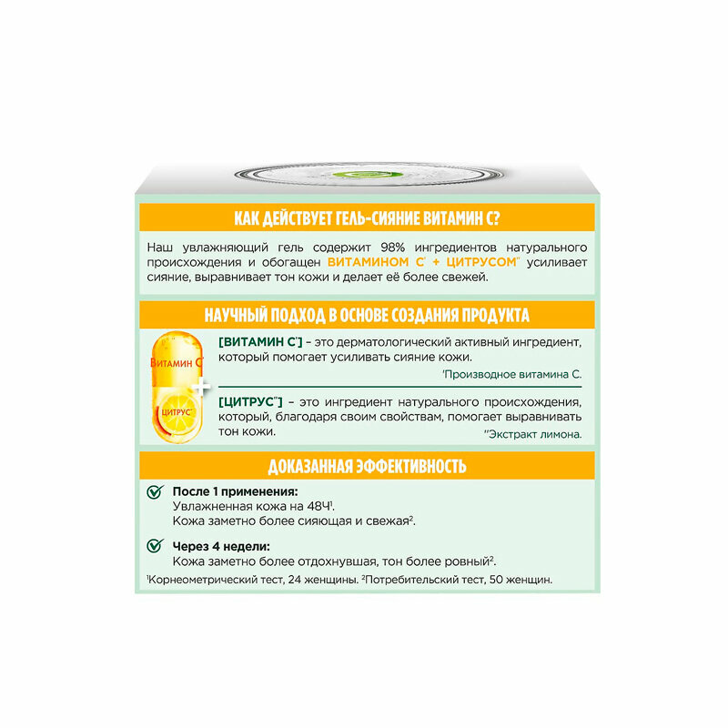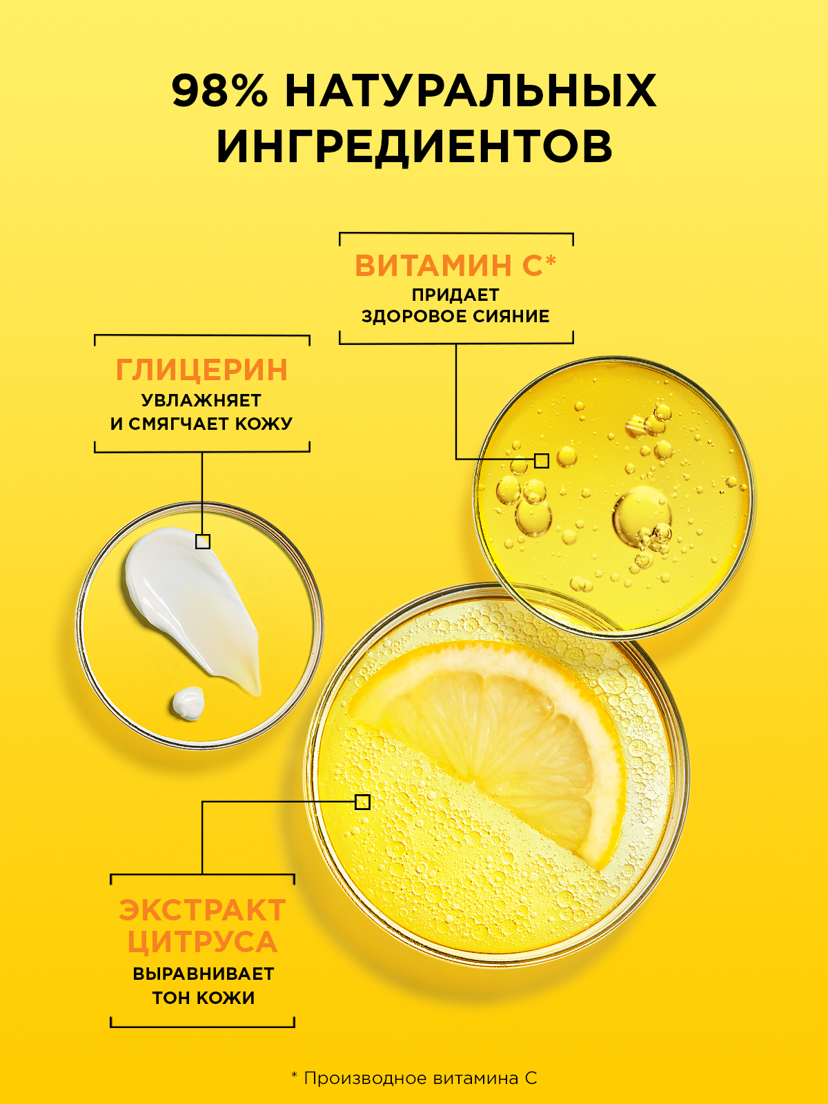 Новый крем Витамин С от Garnier интенсивно увлажняет, усиливает сияние , и делает кожу более гладкой и свежей. Формула содержит 98% натуральных ингредиентов и имеет текстуру, которая легко распределяется и быстро впитывается. Витамин С*- это активный ингредиент, который помогает усилить сияние кожи. Цитрус - помогает выровнять тон кожи.