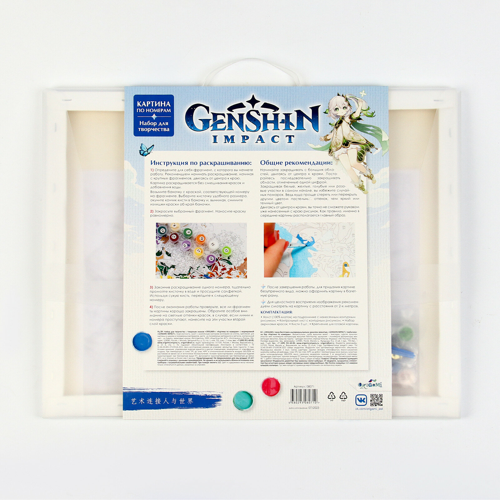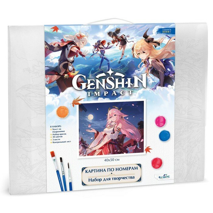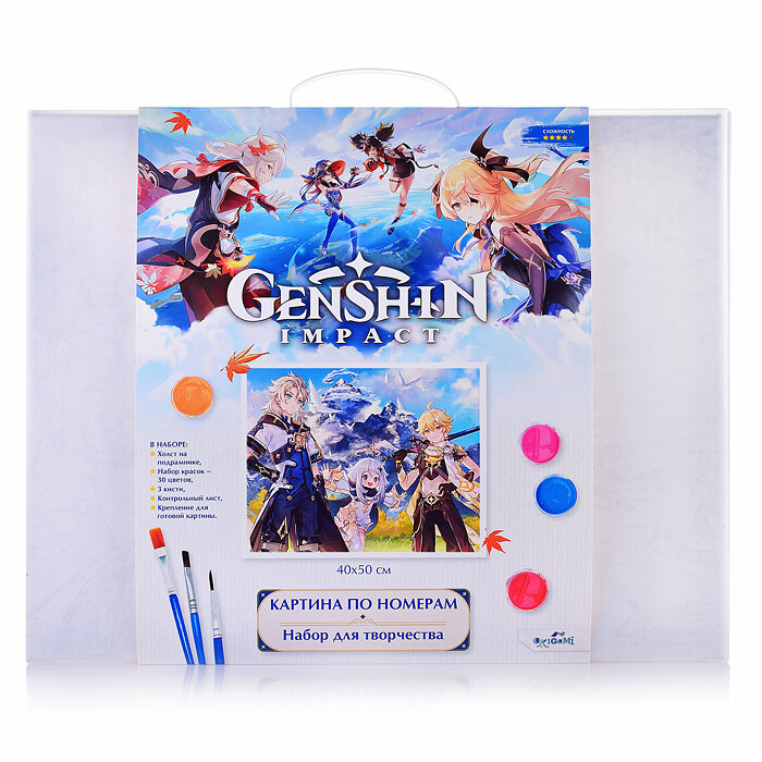 Картины для раскрашивания по номерам по мотивам суперпопулярной компьютерной игры Геншин упакованы в удобную и прочную полупрозрачную пластиковую коробку с ручкой.