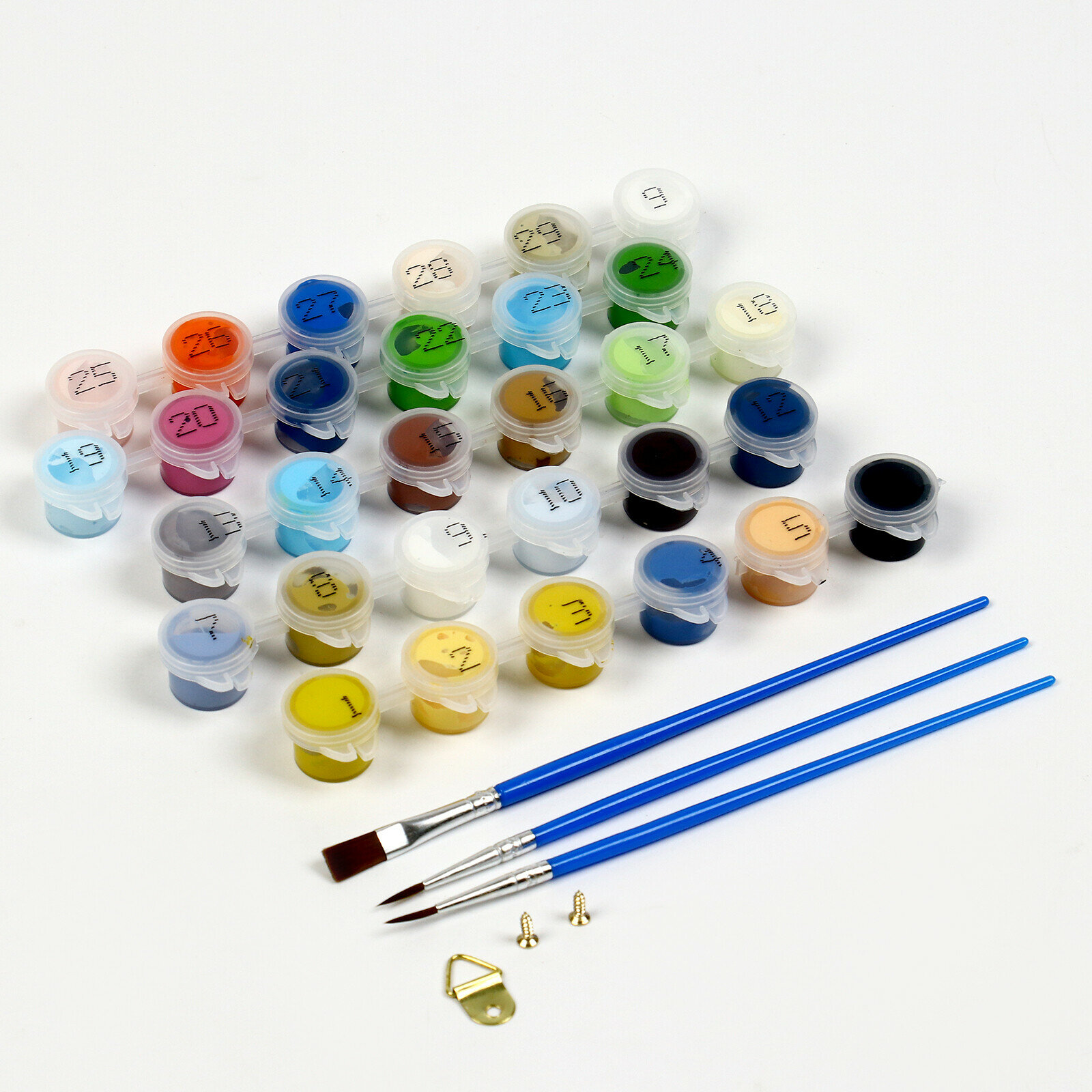 В наборе: холст на подрамнике 40х50 см., набор красок в баночках(30 цветов), набор кисточек (3 шт.), крепление для картины по номерам на стену, контрольный лист-инструкция с нумерацией.