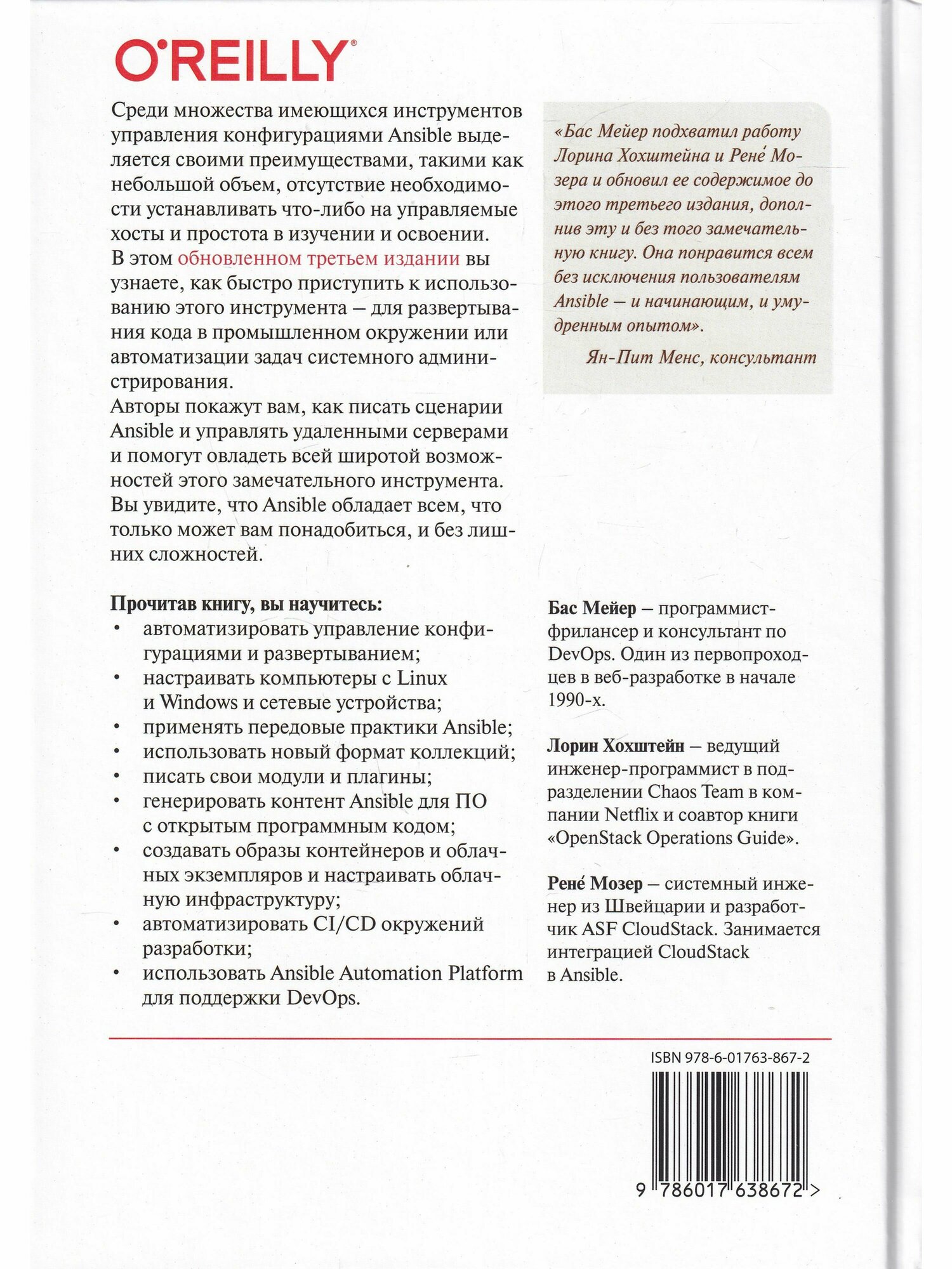"Бас Мейер подхватил работу Лорина Хохштейна и Рене Мозера и обновил ее содержимое до этого третьего издания, дополнив эту и без того замечательную книгу. Она понравится всем без исключения пользователям Ansible - и начинающим, и умудренным опытом".