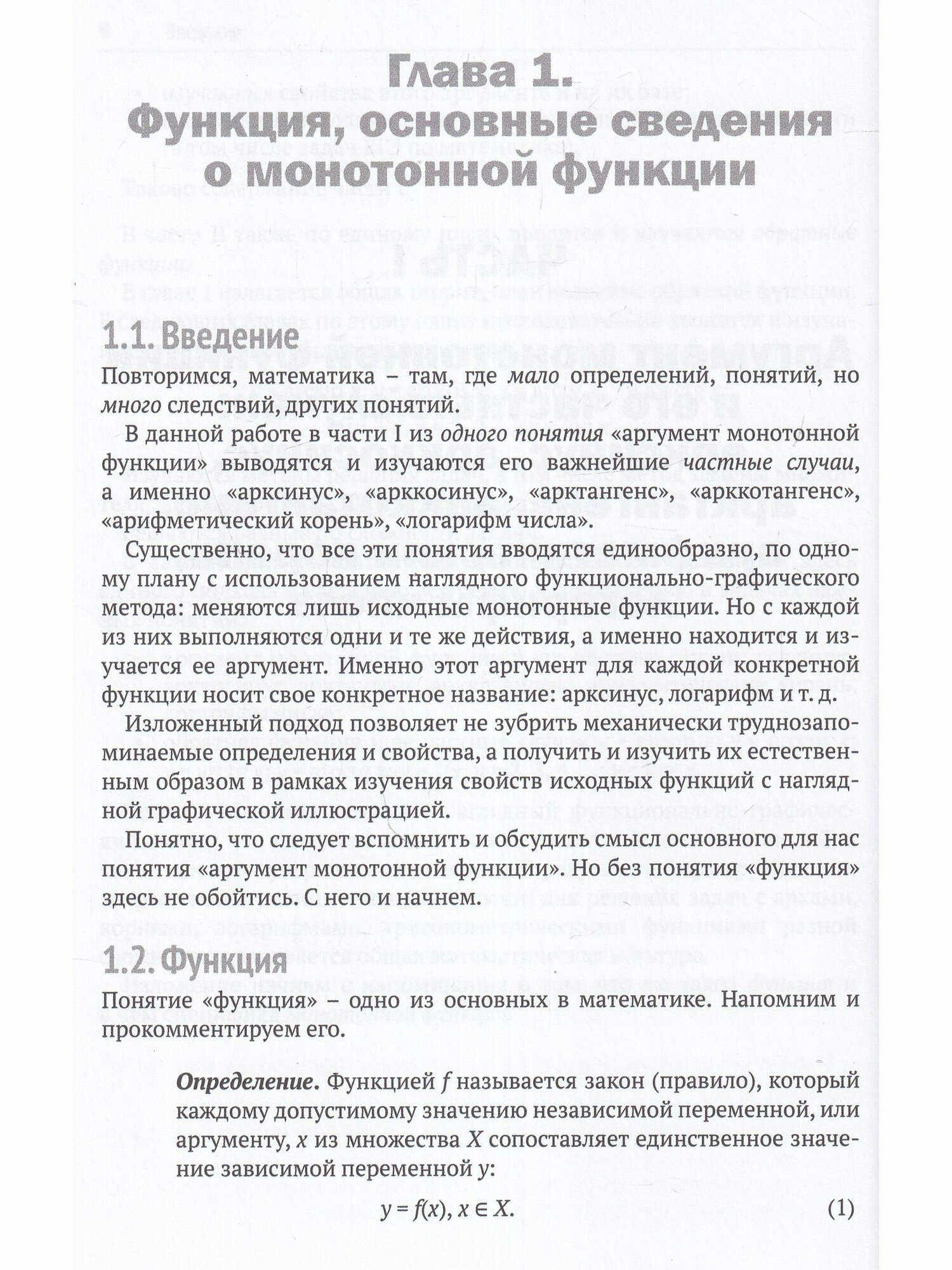 Такие важные понятия, как арксинус, арифметический корень, логарифм числа являются в некотором смысле родственниками, ведь каждое из них - это частный случай понятия "аргумент монотонной функции". Этот факт активно используется в книге, стандартизирует и упрощает изучение всех понятий и соответствующих им функций.