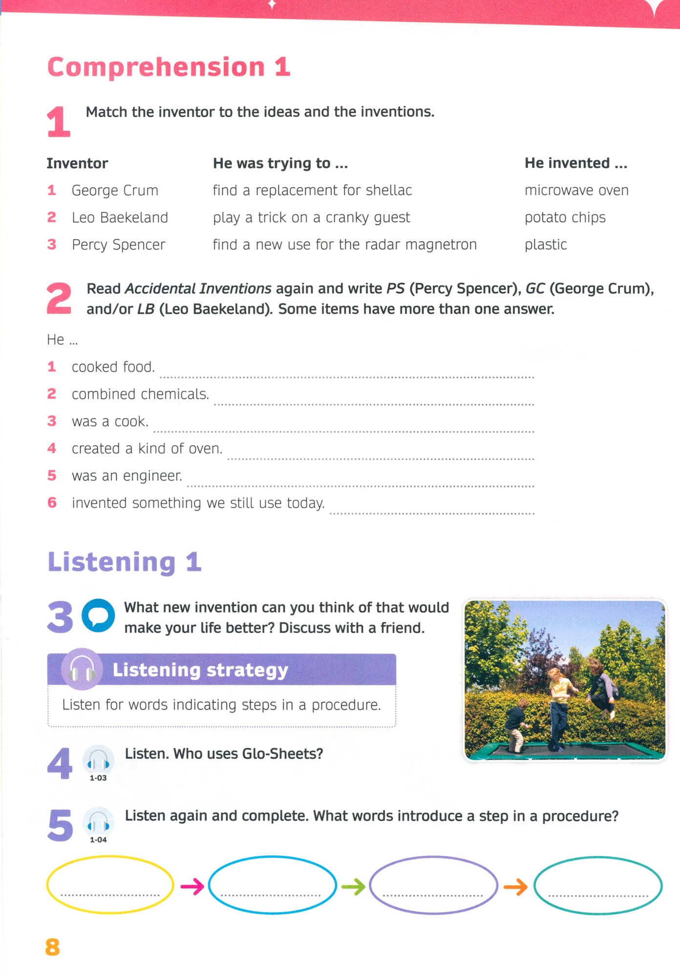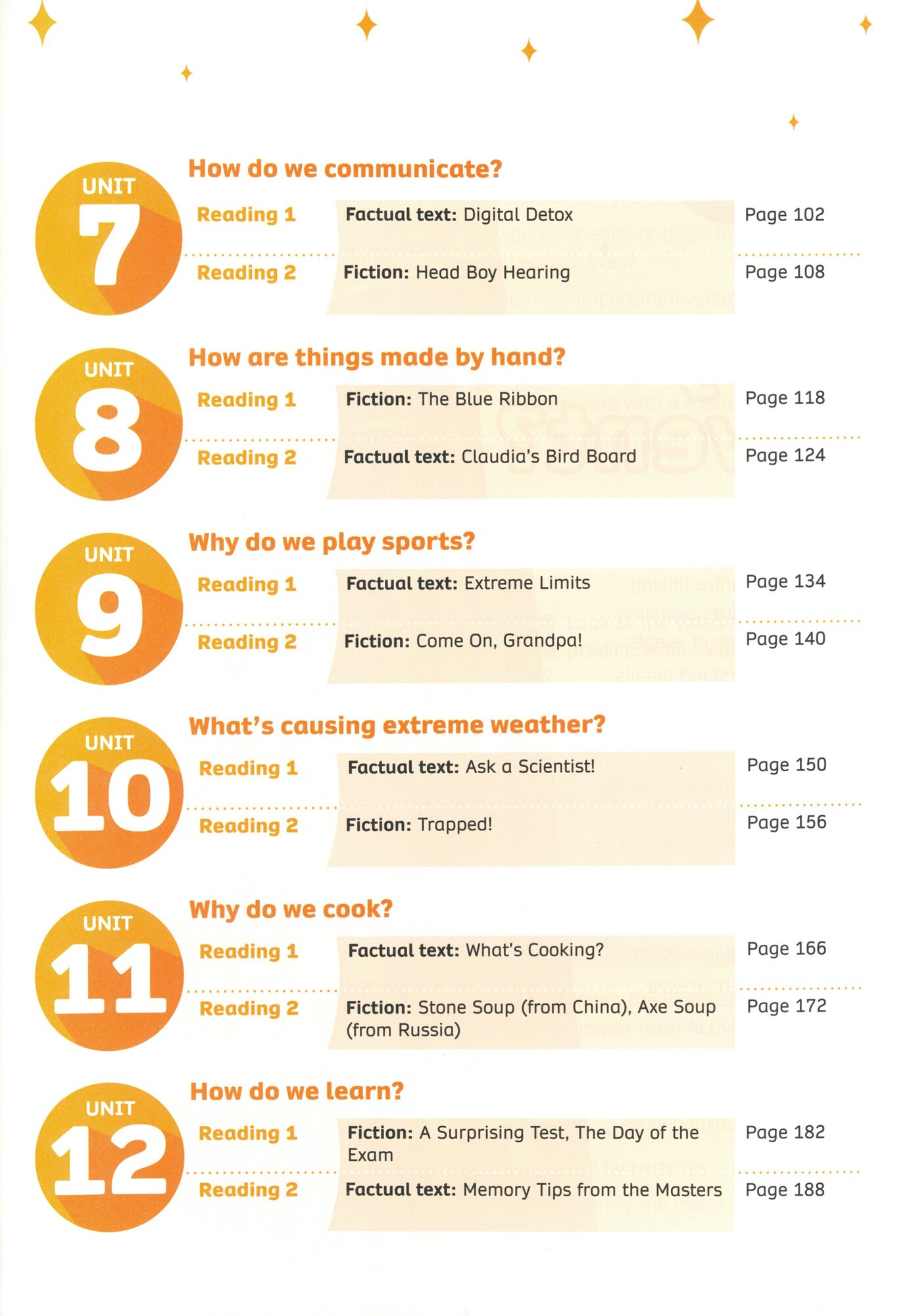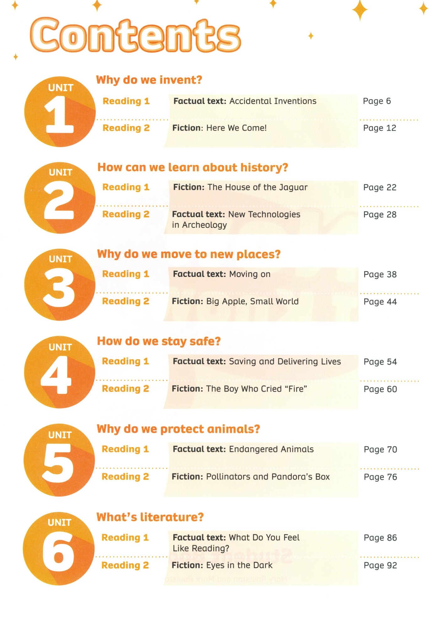 - one text per unit is factual, allowing students to gain non-ELT knowledge, and another text is a story focusing on a value