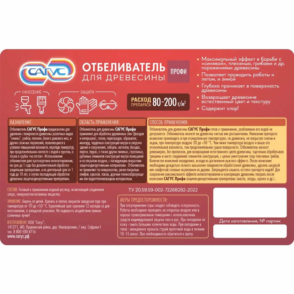 | Инструкция по применению | Отбеливатель для древесины САГУС Профи готов к применению, разбавление его водой не допускается. Отбеливатель наносят на древесину кистью или распылителем. Нанесение препарата возможно производить и при отрицательных температурах, на древесину, не покрытую снегом и льдом, при температуре воздуха -20°С до +50°С. |