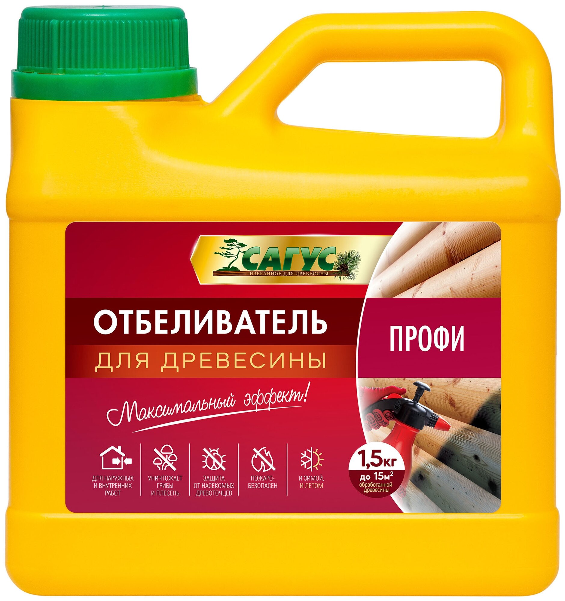 **Отбеливатель для древесины Сагус Профи** применяется для внутренних и внешних работ. Защищает поверхность от образования плесени и грибка, насекомых. Пожаробезопасен. Возвращает древесине природный блеск и цвет. Может использоваться для подготовки поверхностей для последующей обработки — покрытию лаком или краской. Легко наносится с помощью кисти или пульверизатора. Содержит хлор. Изготовлен на водной основе.