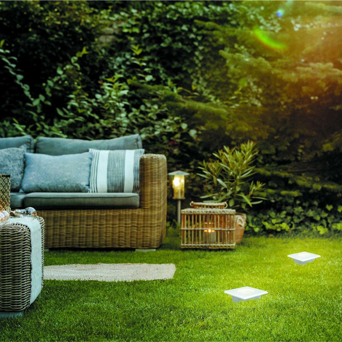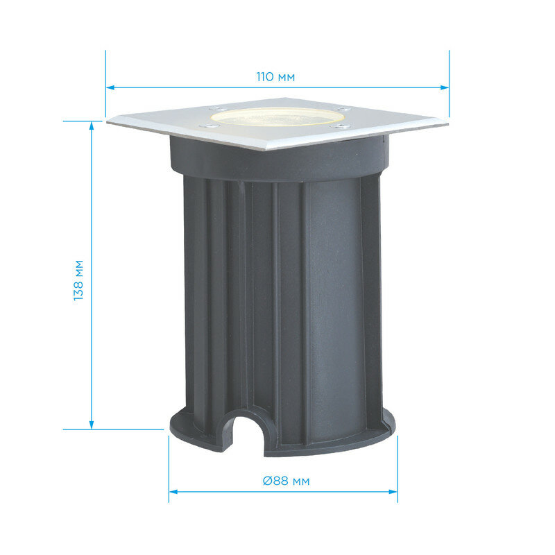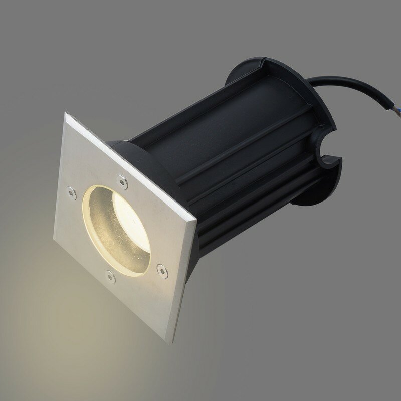 **Светильник грунтовой квадратный Apeyron** выполнен в современном стиле. Предназначен для общего и декоративного освещения дорожек парков, тротуара, газона, подсветки кустов и деревьев. Корпус светильника изготовлен из алюминия, а рассеиватель ― из закаленного стекла. Материалы светильника показывают отличную устойчивость к механическим повреждениям, воздействию температуры и солнечного света. Данное изделие имеет размер 110х110х138 мм и предназначено для монтажа в грунт. Источником свечения выступает галогенная или светодиодная лампа с цоколем типа 1хGU10 и максимальной мощностью 35 Вт (приобретается отдельно). Светильник работает от сети 230 Вольт и не требует дополнительных устройств при подключении. В комплект входят 2 дюбеля, 2 винтовых самореза и установочная коробка. Степень пылевлагозащиты изделия IP67.