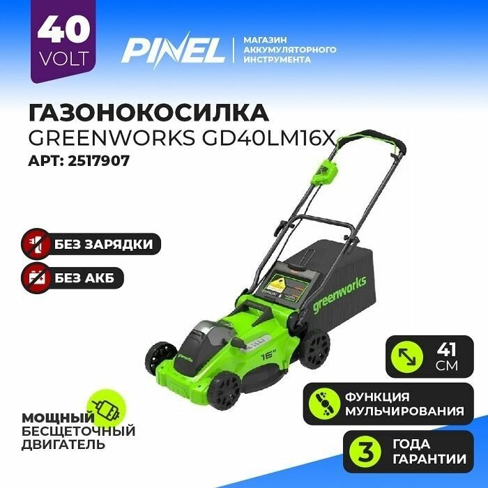 - Газонокосилка аккумуляторная Greenworks GD40LM16X с бесщеточным двигателем, 40V, 41 см (арт 2517907)