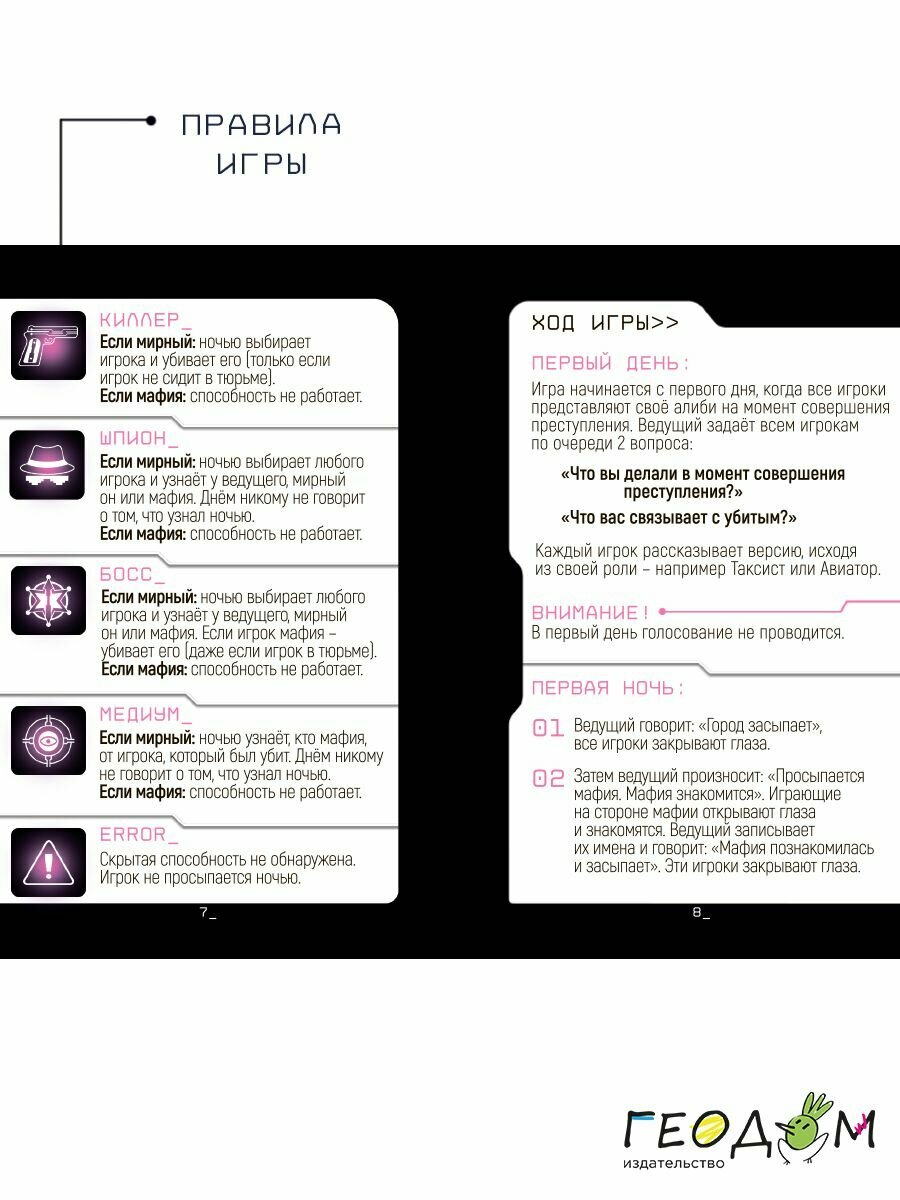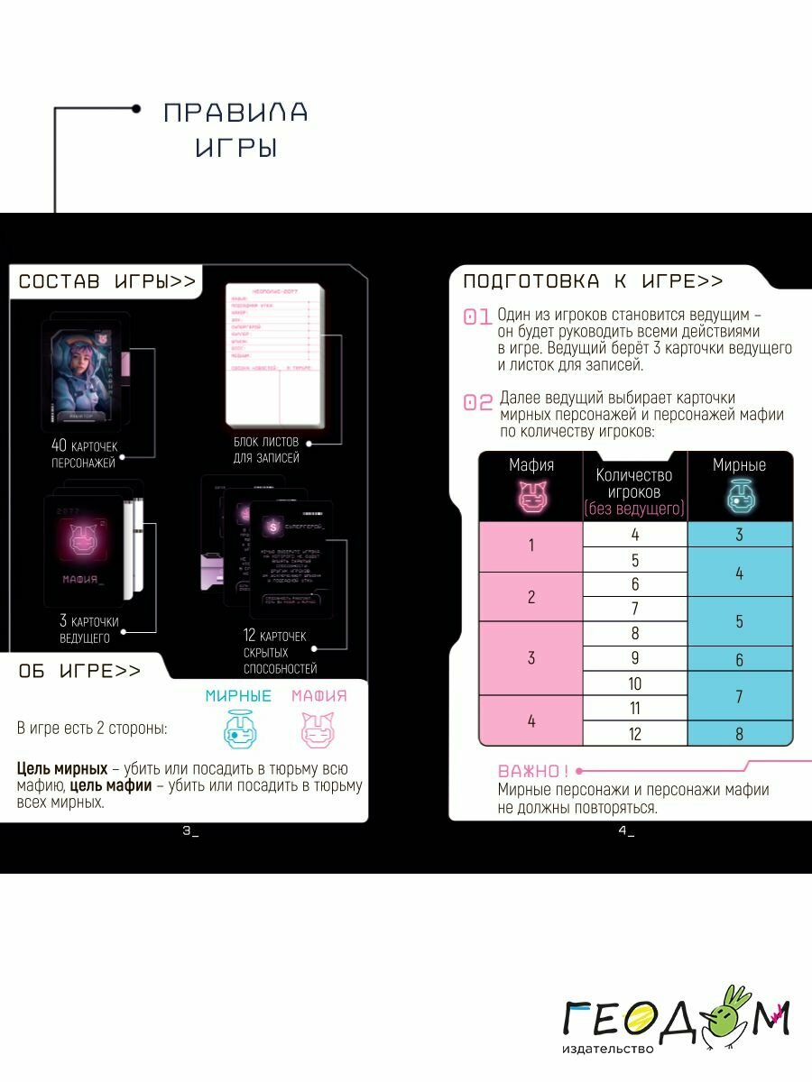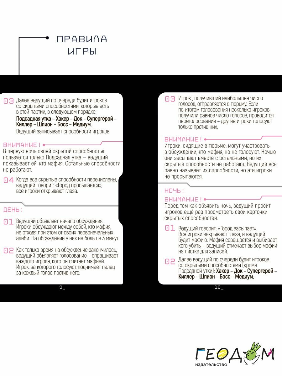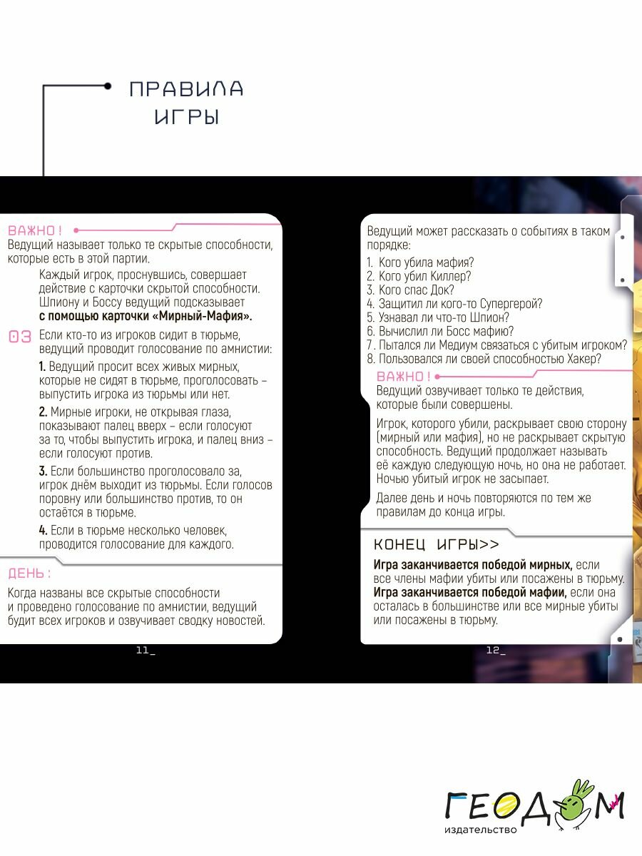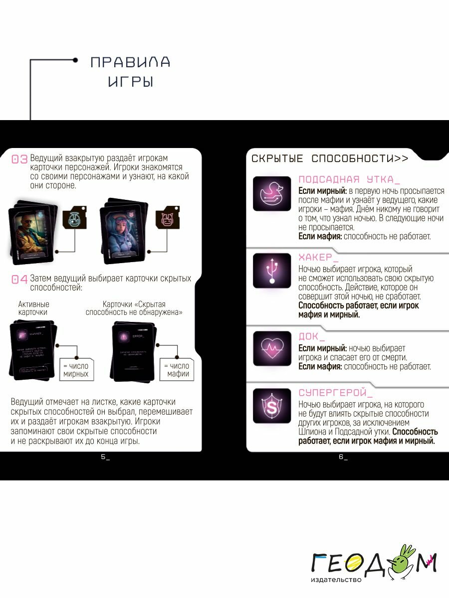 Внутри 40 карточек персонажей, 12 карточек скрытых способностей, 3 карточки ведущего и блок листов для записей.