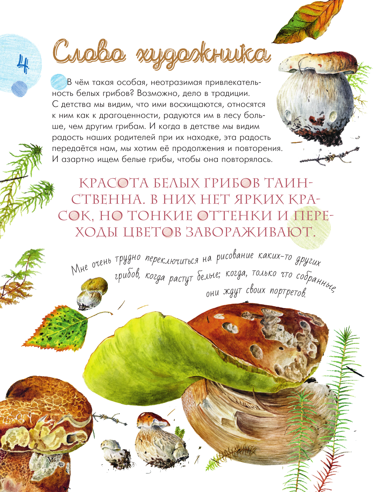 Интересная и полезная информация в сочетании с яркими, сочными иллюстрациями порадует как любителей тихой охоты, так и ценителей искусства. Кроме того, в книгу вставлен мастер-класс по рисованию.