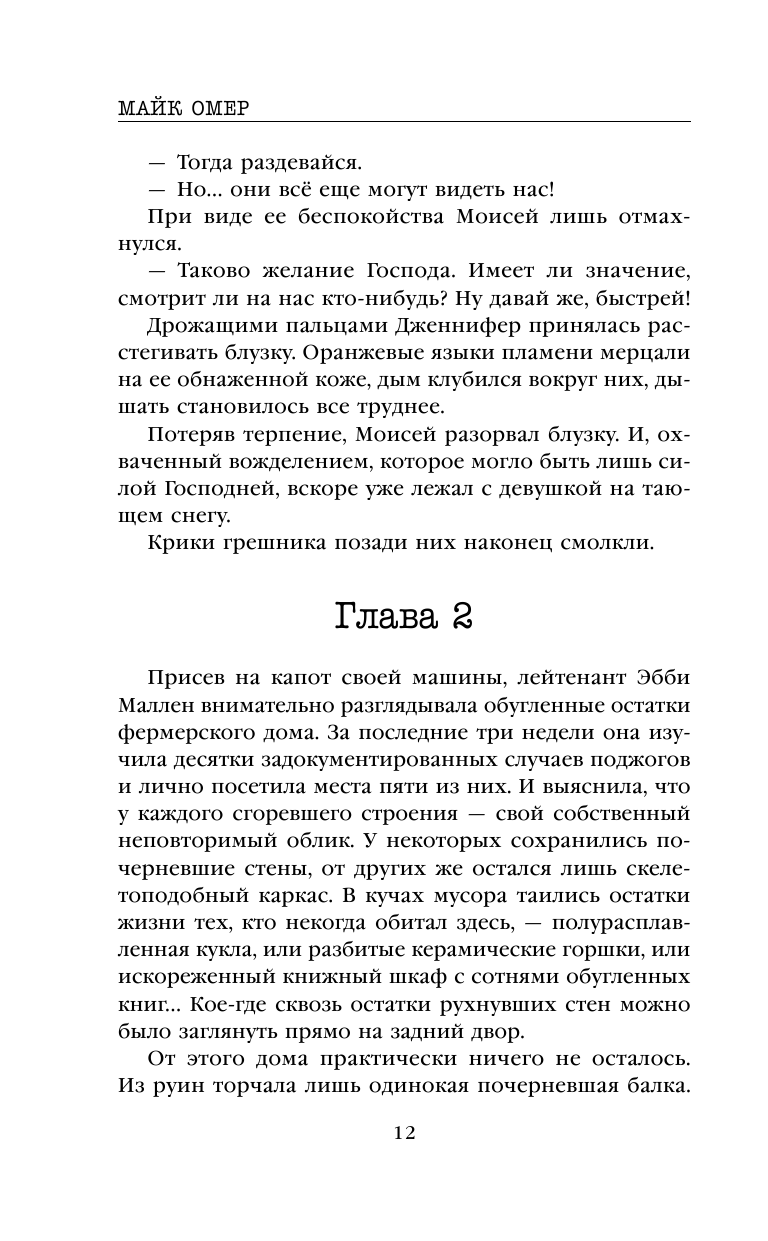 Когда при загадочных обстоятельствах несколько человек сгорели заживо в своих домах, Эбби Маллен, переговорщик полиции Нью-Йорка, сразу почувствовала: ужасы прошлого вернулись. Еще девочкой Эбби чудом спаслась от пожара, устроенного Моисеем Уилкоксом, фанатичным лидером секты. Он считался мертвым в течение тридцати лет. Но теперь на всех местах преступлений остались его следы…