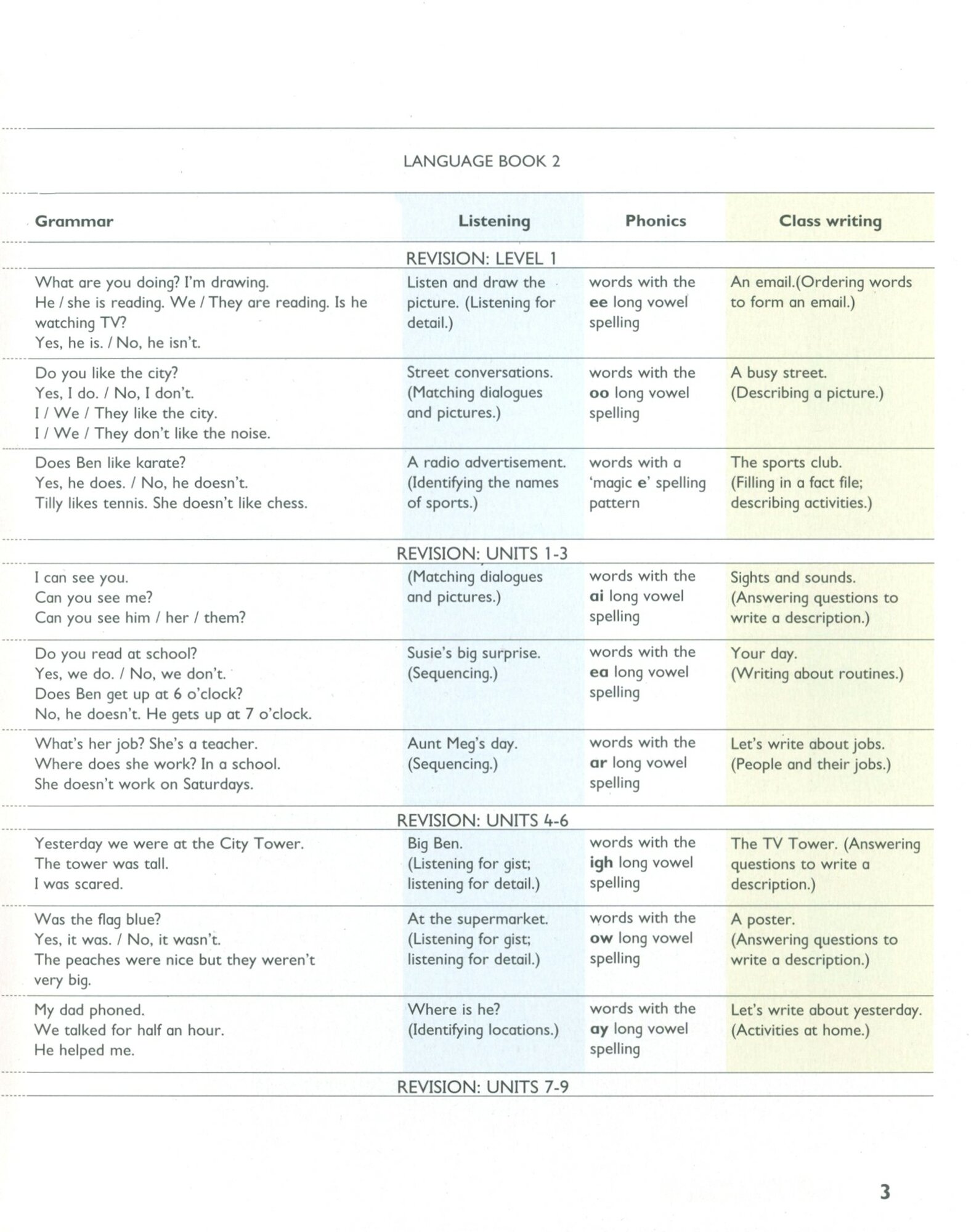 Это пособие дает учащимся возможность отработать базовые навыки, такие как чтение, понимание, построение предложений и речи, грамматика, аудирование, фонетика, правописание и письменная работа в классе. Страницы для повторения закрепляют изученный материал.