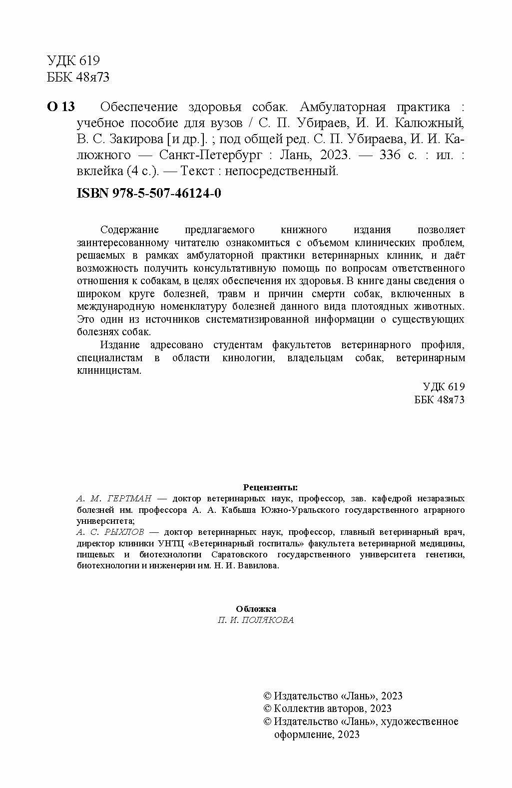 Обеспечение здоровья собак. Амбулаторная практика. Учебное пособие для вузов (Убираев Сергей Петрович, Калюжный Иван Исаевич, Закирова Виктория Сергеевна); Лань, 2023