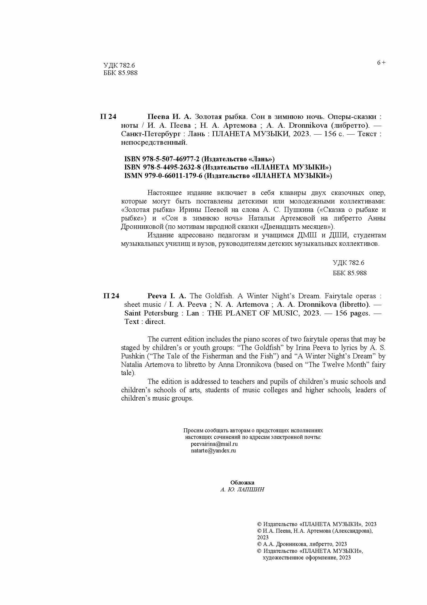 Настоящее издание включает в себя клавиры двух сказочных опер, которые могут быть поставлены детскими или молодежными коллективами: "Золотая рыбка" Ирины Пеевой на слова А. С. Пушкина ("Сказка о рыбаке и рыбке") и "Сон в зимнюю ночь" Натальи Артемовой на либретто Анны Дронниковой (по мотивам народной сказки "Двенадцать месяцев").