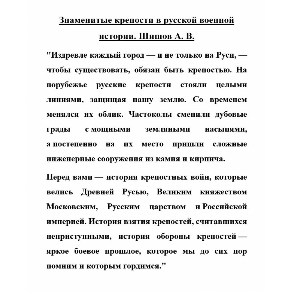 Перед вами - история крепостных войн, которые велись Древней Русью, Великим княжеством Московским, Русским царством и Российской империей. История взятия крепостей, считавшихся неприступными, история обороны крепостей - яркое боевое прошлое, которое мы до сих пор помним и которым гордимся.