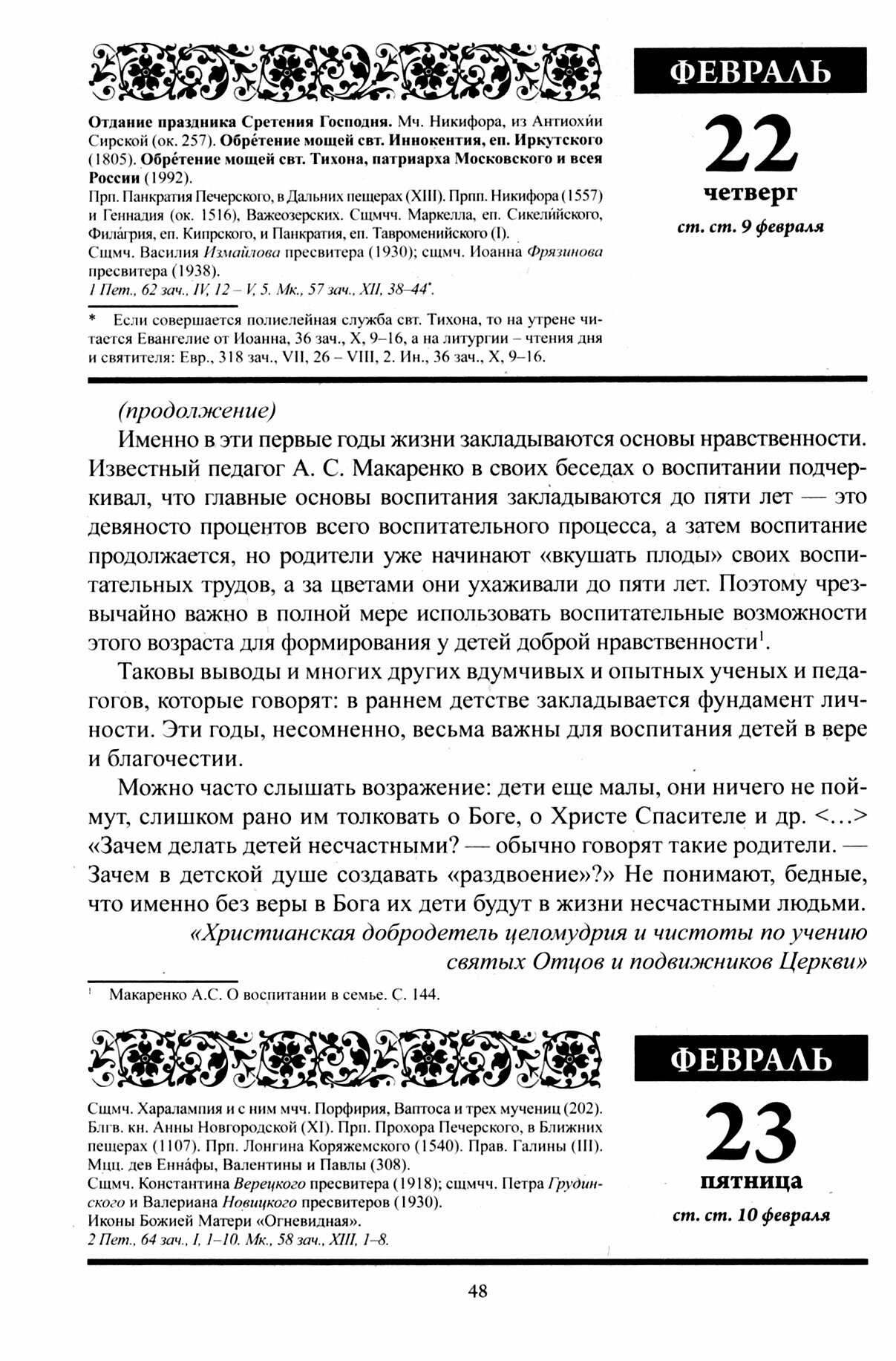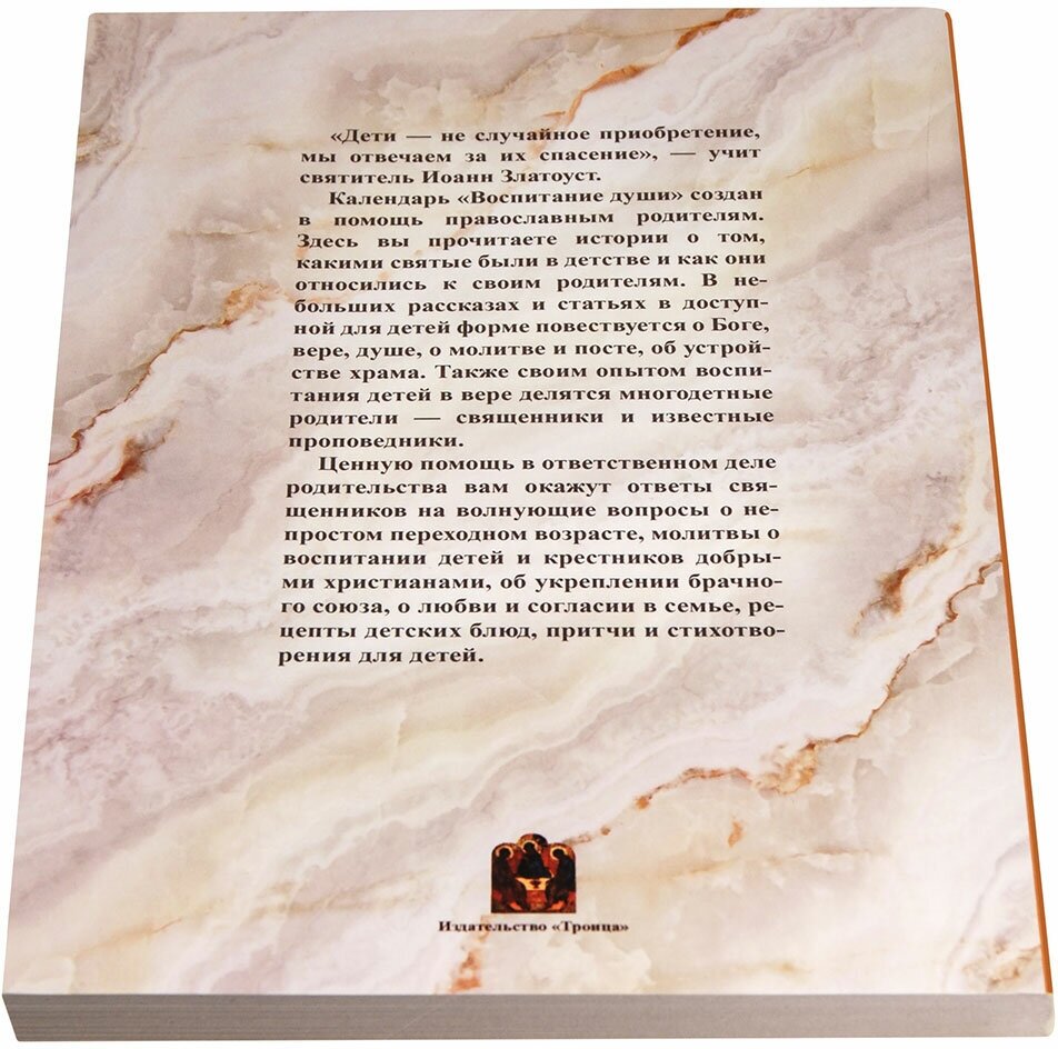Календарь "Воспитание души" с ежедневными чтениями адресован родителям, крестным и всем православным христианам, которых волнует воспитание детей и подростков. Святые отцы сравнивают воспитание с действиями хорошего садовника, который бережно подвязывает маленькое деревце к колышку, следит, чтобы растение не искривилось и не повредилось, заботится о нем и бережет его, а когда оно подрастет, убирает ограду, и окрепшее дерево начинает приносить плод. Так и в формировании детей, которых нам вверил Господь: очень важно и "не пережать", дать свободу росту и творчеству ребенка и оберегать его от вредных воздействий среды, проявлений его собственной греховной природы. В русле такого подхода подобраны отрывки календаря. Читатель найдет в нем евангельские уроки, изложенные интересным для детей языком, воспоминания о воспитании в семье царственных страстотерпцев, святоотеческие наставления. Большое внимание уделено чтению как увлекательному семейному занятию, формирующему личность ребенка и дающему почву для бесед на темы нравственности и христианских идеалов. Об этом - рубрика "Книжная полка", в которой даны советы о чтении от священников и профессионалов, тематические списки литературы, отрывки из лучших детских книг. Идеи для совместного досуга с детьми вы найдете в рубрике "Вместе весело". Календарь традиционно содержит молитвы о детях в различных ситуациях и основные богослужебные тексты в дни великих церковных праздников.