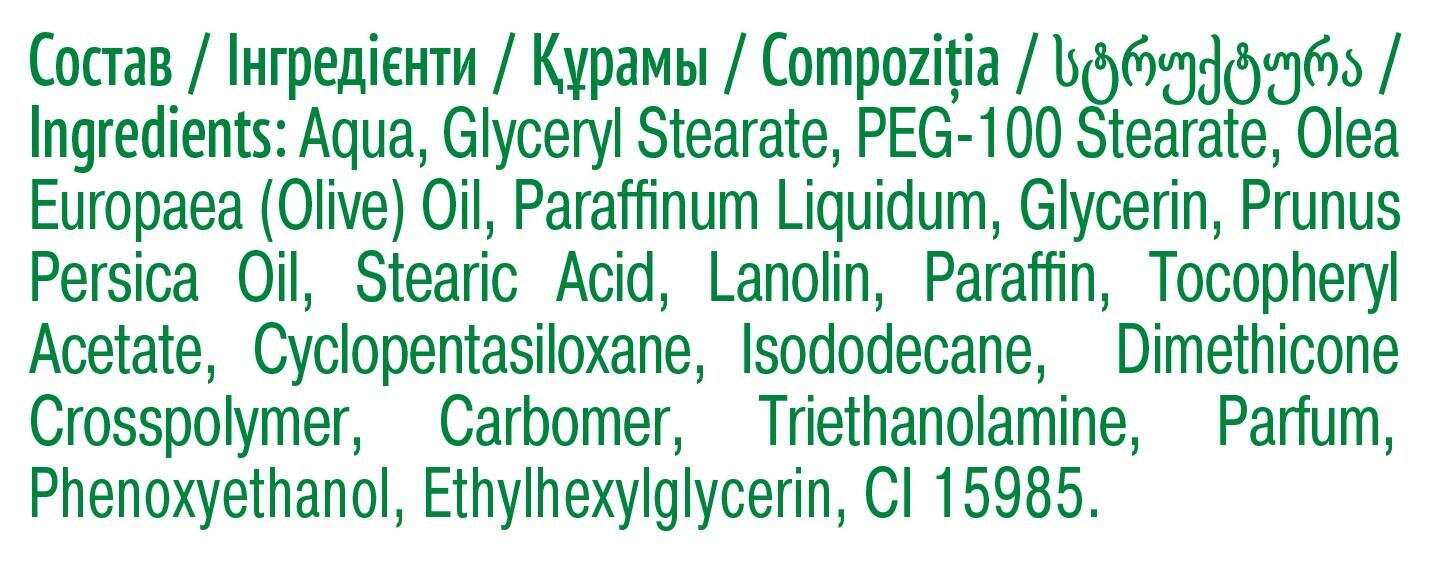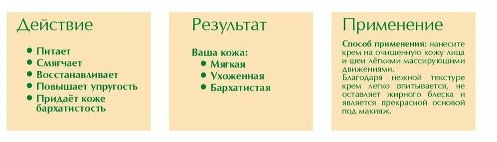 Крем предназначен для ухода за кожей лица в любое время суток. Он содержит натуральное персиковое масло, натуральный ланолин, оливковое масло и витамин Е. Активные компоненты крема питают кожу, восстанавливают её гидролипидный барьер, придают ей мягкость и бархатистость. Крем легко впитывается, не оставляя жирного блеска, оказывает лёгкое матирующее действие.