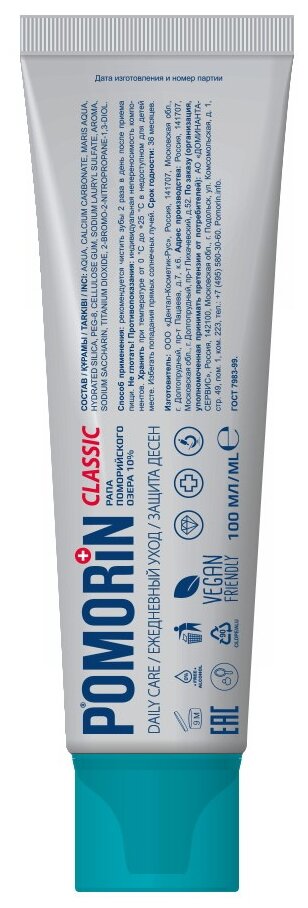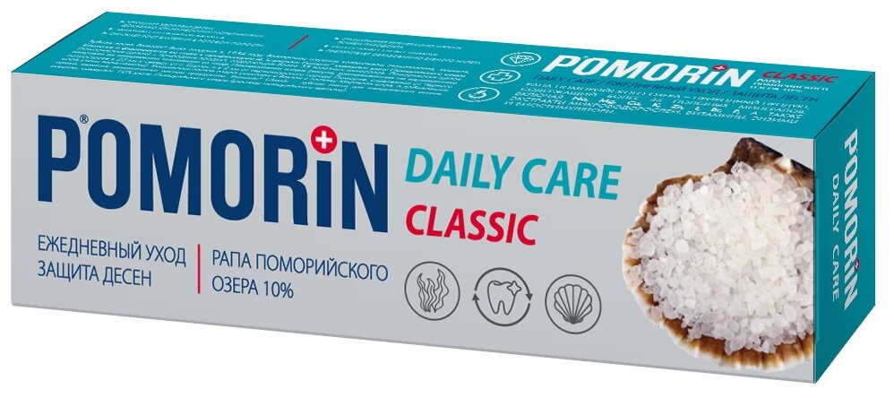 Внешний вид и свойства: паста белого цвета с медицинским запахом. Pomorin Classic Daily Care обеспечивает комплексную защиту дёсен.