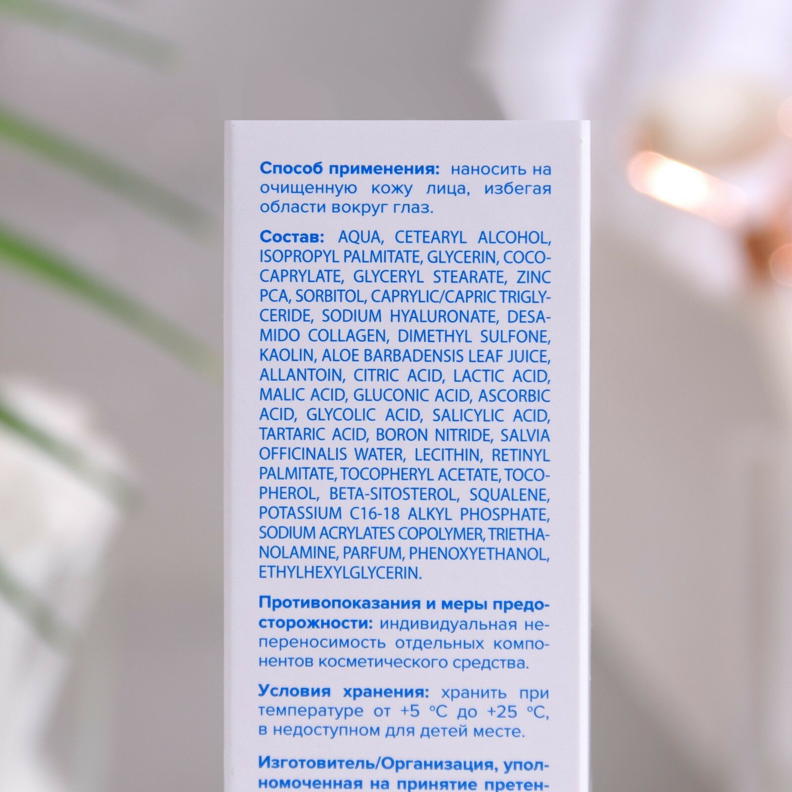 | Состав | Aqua, Cetearyl Alcohol, Isopropyl Palmitate, Glycerin, Coco-Caprylate, Glyceryl Stearate, Zinc PCA, Sorbitol, Caprylic/Capric Triglyceride, Sodium Hyaluronate, Desamido Collagen, Dimethyl Sulfone, Kaolin, Aloe Barbadensis Leaf Juice, Allantoin, Citric Acid, Lactic Acid, Malic Acid, Gluconic Acid, Ascorbic Acid, Glycolic Acid, Salicylic Acid, Tartaric Acid, Boron Nitride, Salvia Officinalis Water, Lecithin, Retinyl Palmitate, Tocopheryl Acetate, Tocopherol, Beta-Sitosterol, Squalene, Potassium C16-18 Alkyl Phosphate, Sodium Acrylates Copolymer, Triethanolamine, Parfum, Phenoxyethanol, Ethylhexylglycerin. |