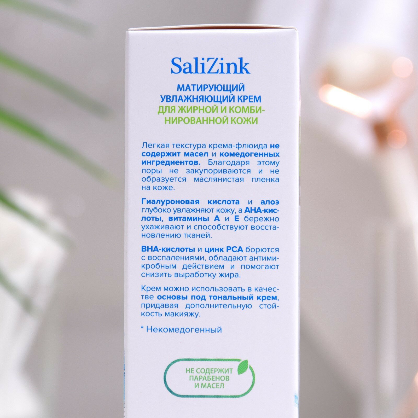 Крем матирующий Салицинк для жирной и комбинированной кожи устраняет жирный блеск и прыщи. Стойкая основа под макияж.Легкая текстура крема-флюида не содержит масел и комедогенных ингредиентов. Благодаря этому поры не закупориваются и не образуется маслянистая пленка на коже. Гиалуроновая кислота и алоэ глубоко увлажняют, а AHA-кислоты, витамины А и Е бережно ухаживают и ускоряют восстановление барьерных функций кожи. BHA-кислота и цинк РСА борются с воспалениями, обладают антимикробным действием и помогают снизить выработку жира. Глина адсорбирует излишки кожного жира и матирует. Нитрид бора придает лицу красивый, ровный тон. Средство можно использовать в качестве основы под тональный крем, придавая дополнительную стойкость макияжу. Некомедогенный. Не содержит масла и парабены. Состав: aqua, cetearyl alcohol, isopropyl palmitate, glycerin, coco-caprylate, glyceryl stearate, zinc PCA, sorbitol, caprylic/capric triglyceride, sodium hyaluronate, desamido collagen, dimethyl sulfone, kaolin, aloe barbadensis leaf juice, allantoin, citric acid, lactic acid, malic acid, gluconic acid, ascorbic acid, glycolic acid, salicylic acid, tartaric acid, boron nitride, salvia officinalis water, lecithin, retinyl palmitate, tocopheryl acetate, tocopherol, beta-sitosterol, squalene, potassium C16-18 alkyl phosphate, sodium acrylates copolymer, triethanolamine, parfum, phenoxyethanol, ethylhexylglycerin.Способ применения: наносить на очищенную кожу лица, избегая области вокруг глаз.