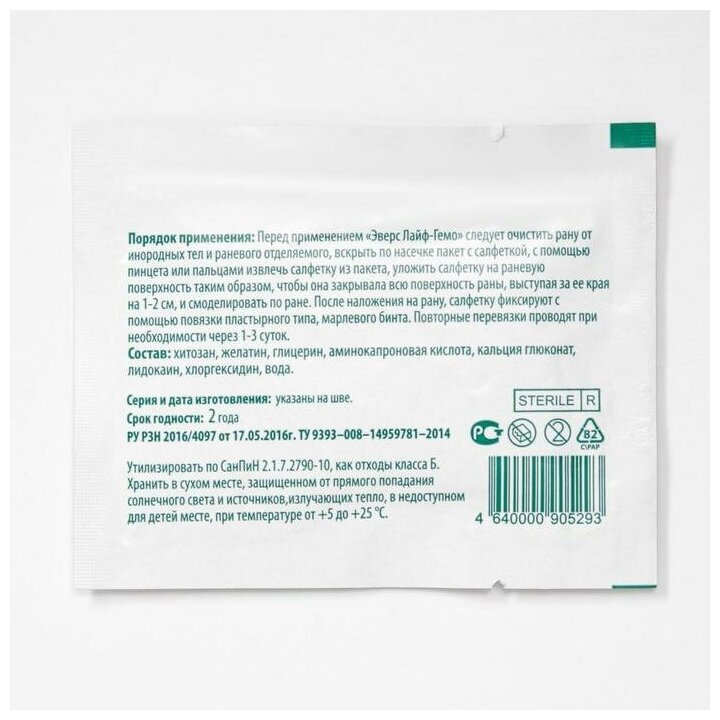Средство перевязочное гидрогелевое стерильное кровоостанавливающее ЭверсЛайф-Гемо Gemo Evers Life 13см х 18см ООО Эвтекс (570940)