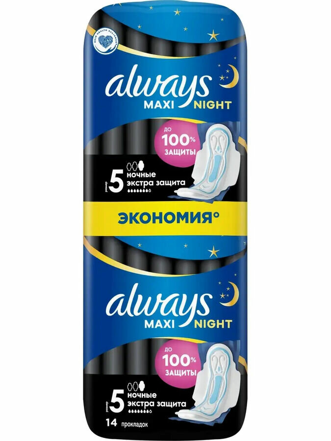 Гигиенические прокладки Always Maxi Normal обеспечивают защиту и комфорт, когда вам это необходимо больше всего. Гигиеническая прокладка Always Maxi Night это прокладка с дополнительной толщиной, которая обеспечивает до 100% защиты благодаря своим защитным барьерам от протекания по всей поверхности и дополнительному впитывающему внутреннему слою в центре. - Гигиенические прокладки, обеспечивающие до 100% защиты. - Защитные барьеры от протекания по всей поверхности. - Ультравпитывающий внутренний слой. - Комфортный верхний слой. - Одобрены дерматологами Ассоциации здоровья кожи (Skin Health Alliance).