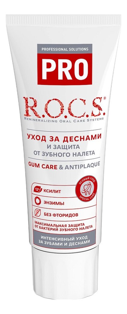 Зубная паста для ежедневного использования R.O.C.S. Pro Gum Care & Antiplaque уменьшает риск возникновения заболеваний в полости рта, основной причиной которых является зубной налет. Паста существенно замедляет образование зубного налета, быстро улучшает состояние десен, уменьшает кровоточивость, защищает от бактерий, укрепляет эмаль, эффективна против кариеса, сохраняет гладкость и чистоту зубов в течение дня. Активные компоненты: * Растительный фермент растворяет зубной налет, препятствует адгезии бактерий, снижает воспаление и уменьшает кровоточивость десен * Ксилит 12% нормализует микробный баланс, способствует реминерализацииэмали * Биодоступные соединения минералов реминерализуютэмаль, восстанавливают естественный блеск и белизну зубов * Содержит активные очищающие гранулы Не содержит фтор, SLS, парабены, диоксид титана.