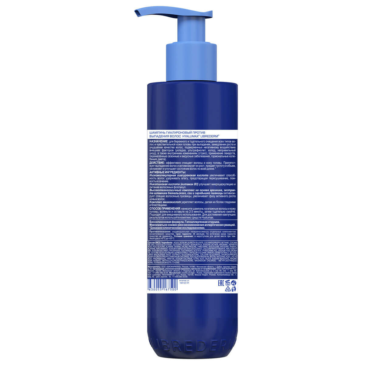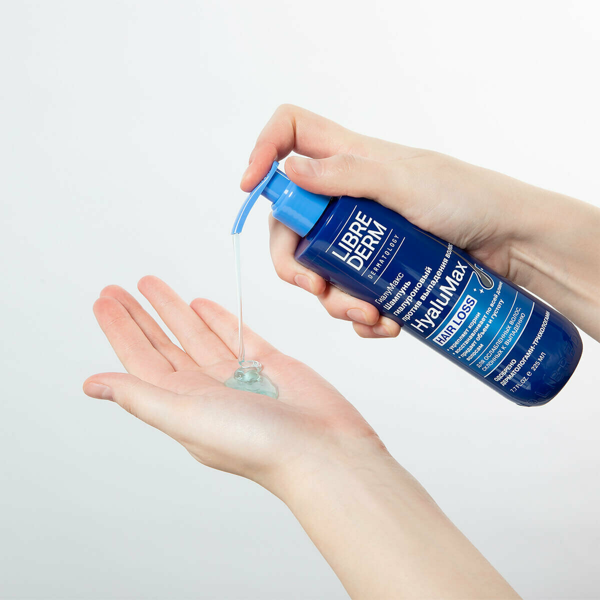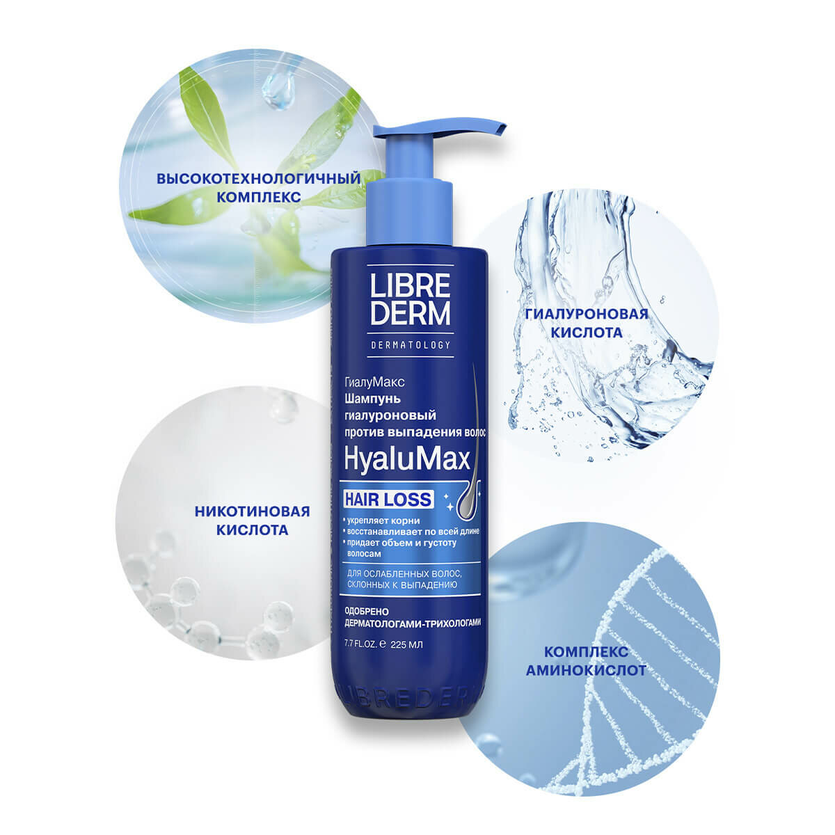 LIBREDERM HyaluMax Шампунь гиалуроновый против выпадения волос 225 мл. Шампунь для бережного и тщательного очищения всех типов волос и чувствительной кожи головы при выпадении, замедлении роста и ухудшении качества волос, подверженных негативному воздействию внешних факторов (укладка, ультрафиолет, холод, неправильный уход), а также внутренним изменениям (стресс, применение лекарств, перенесённые сезонные и вирусные заболевания, гормональные колебания, диета). ЭФФЕКТИВНОСТЬ: эффективно очищает волосы и кожу головы; препятствует выпадению волос и активизирует их рост; придает густоту и объем;увлажняет и улучшает состояние волос по всей длине;АКТИВНЫЕ КОМПОНЕНТЫ: Низкомолекулярная гиалуроновая кислота увеличивает способность волос удерживать влагу, предотвращая пересушивание, ломкость и сечение; Никотиновая кислота (витамин В3) улучшает микроциркуляцию и питание волосяных фолликул; Высокотехнологичный комплекс на основе аргинина, экстракта шлемника байкальского, сои и зародышей пшеницы, активизирует спящие волосяные луковицы, увеличивает фазу активного роста новых волос; Комплекс аминокислот укрепляет волосы, делая их более гладкими и блестящими.