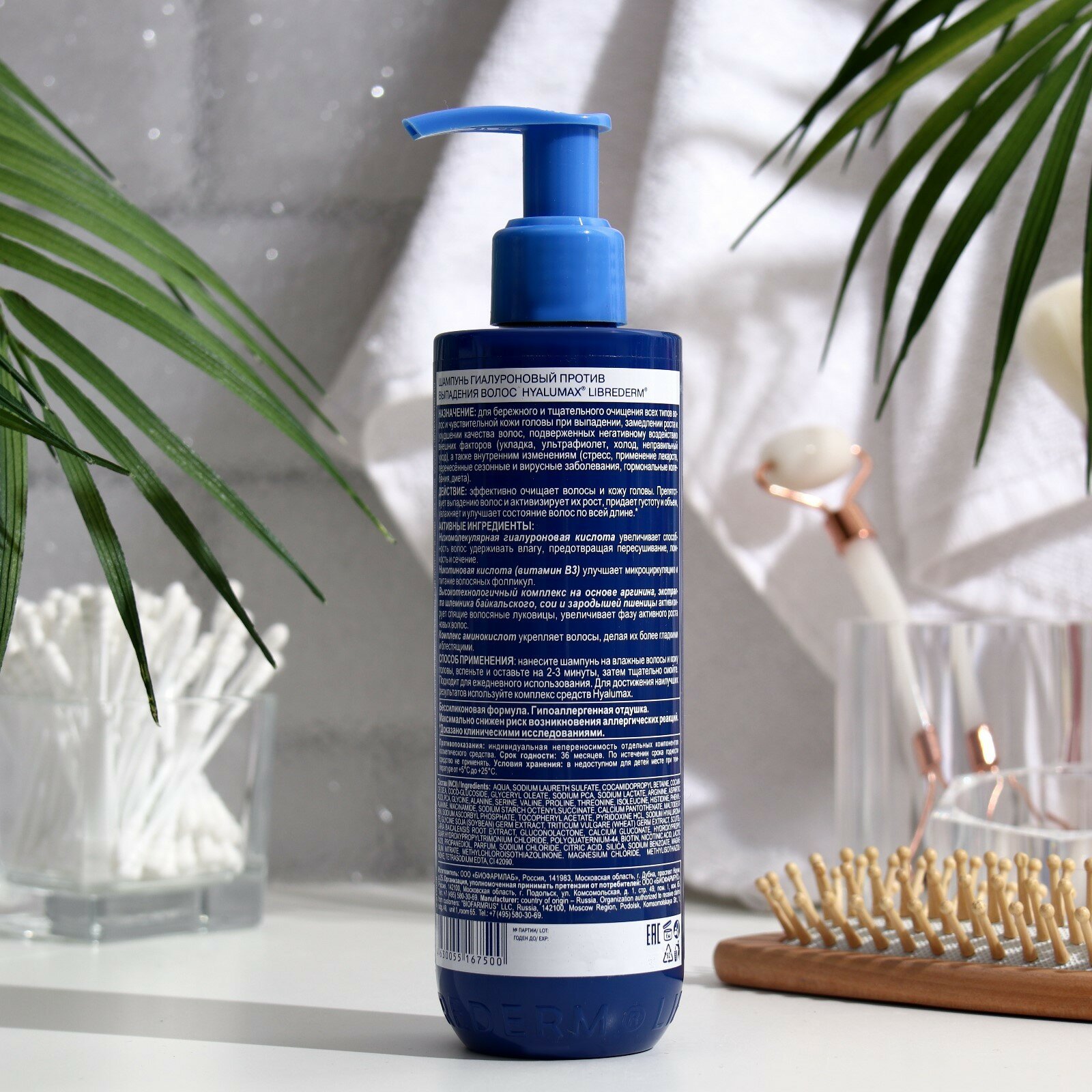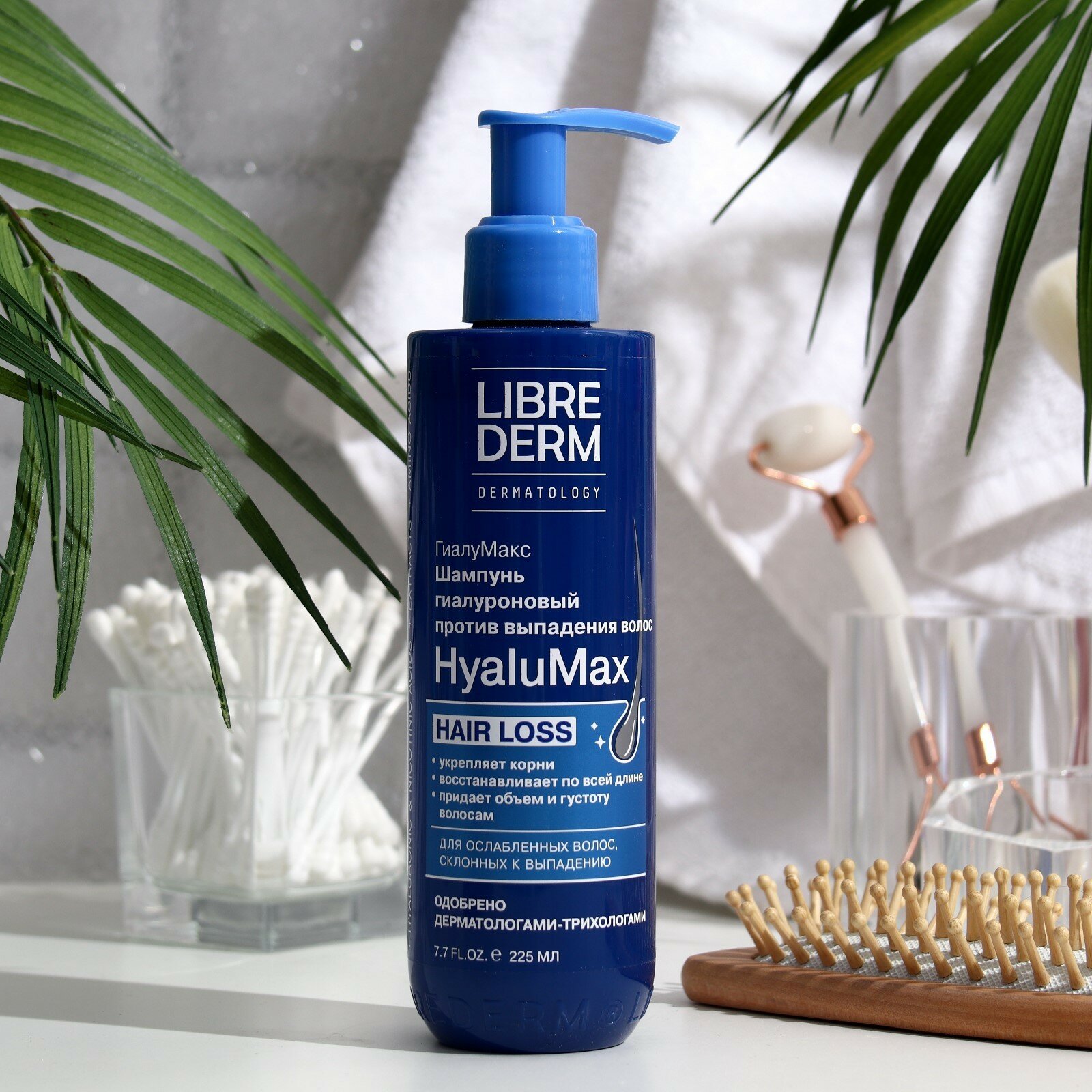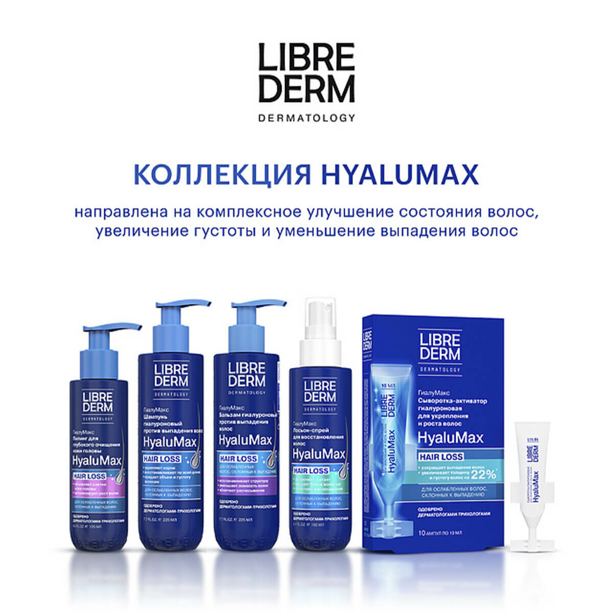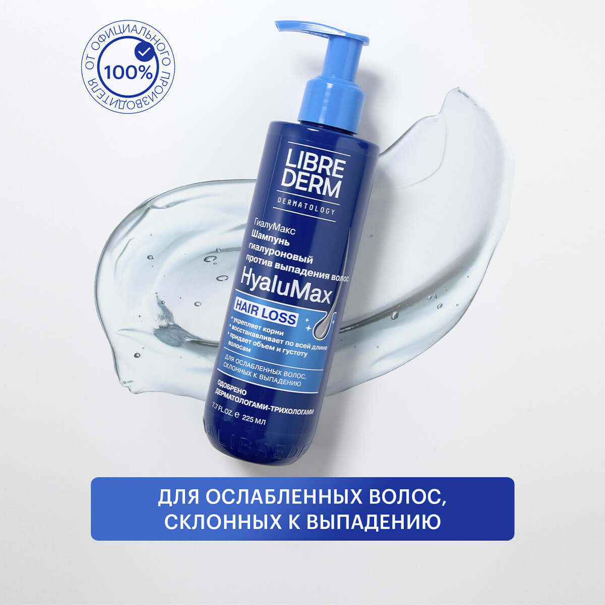 LIBREDERM HyaluMax Шампунь гиалуроновый против выпадения волос 225 мл. Шампунь для бережного и тщательного очищения всех типов волос и чувствительной кожи головы при выпадении, замедлении роста и ухудшении качества волос, подверженных негативному воздействию внешних факторов (укладка, ультрафиолет, холод, неправильный уход), а также внутренним изменениям (стресс, применение лекарств, перенесённые сезонные и вирусные заболевания, гормональные колебания, диета). ЭФФЕКТИВНОСТЬ: эффективно очищает волосы и кожу головы; препятствует выпадению волос и активизирует их рост; придает густоту и объем;увлажняет и улучшает состояние волос по всей длине;АКТИВНЫЕ КОМПОНЕНТЫ: Низкомолекулярная гиалуроновая кислота увеличивает способность волос удерживать влагу, предотвращая пересушивание, ломкость и сечение; Никотиновая кислота (витамин В3) улучшает микроциркуляцию и питание волосяных фолликул; Высокотехнологичный комплекс на основе аргинина, экстракта шлемника байкальского, сои и зародышей пшеницы, активизирует спящие волосяные луковицы, увеличивает фазу активного роста новых волос; Комплекс аминокислот укрепляет волосы, делая их более гладкими и блестящими.