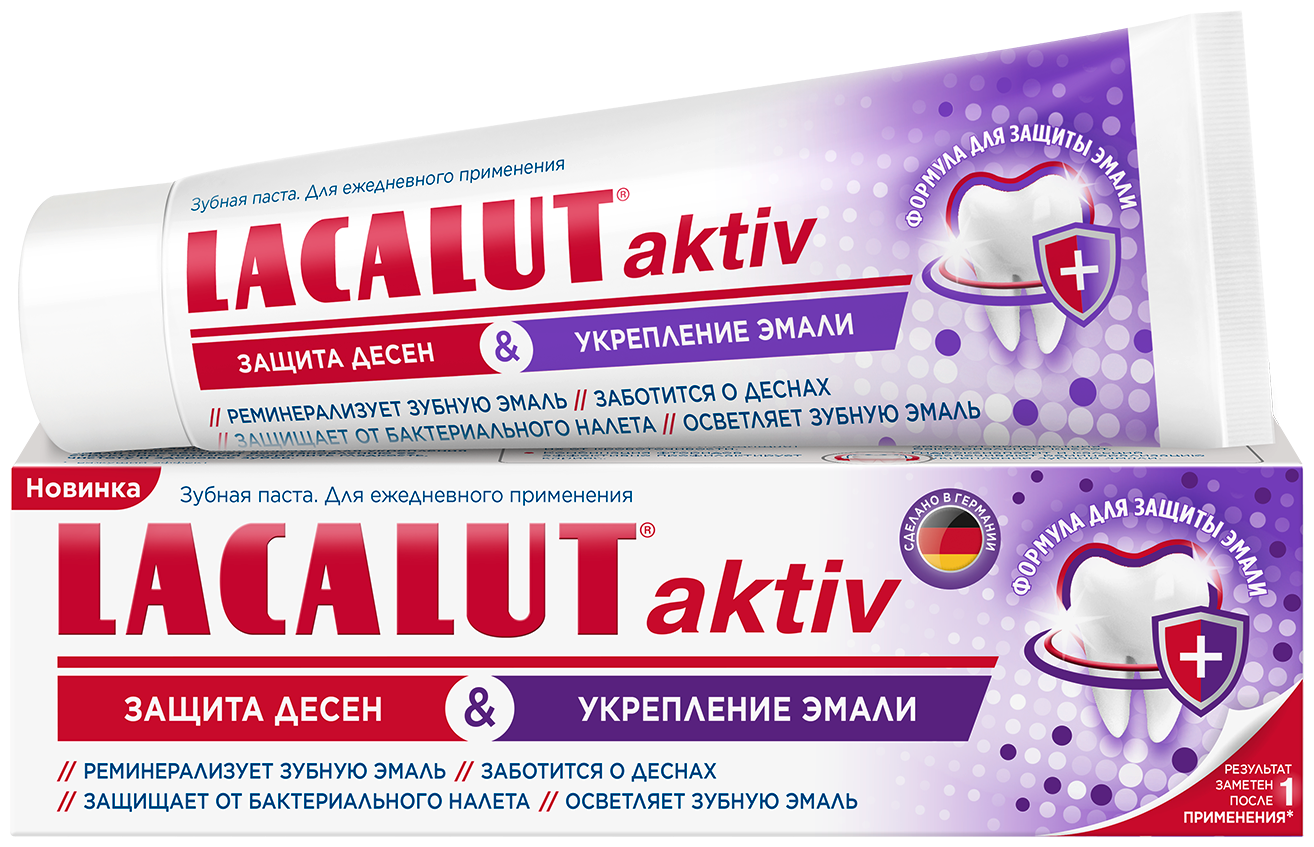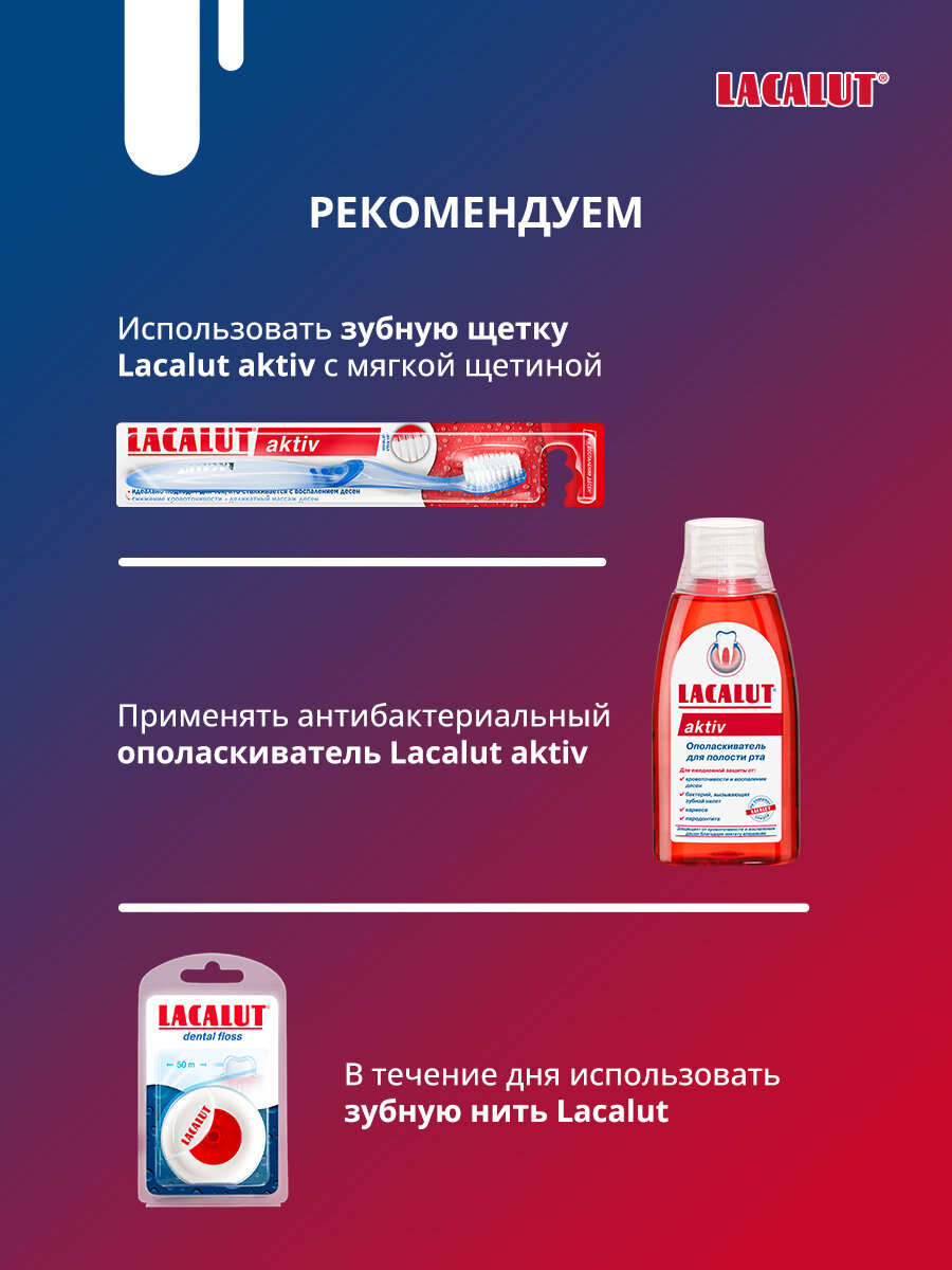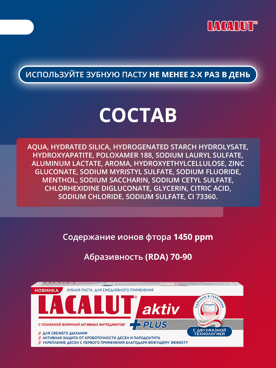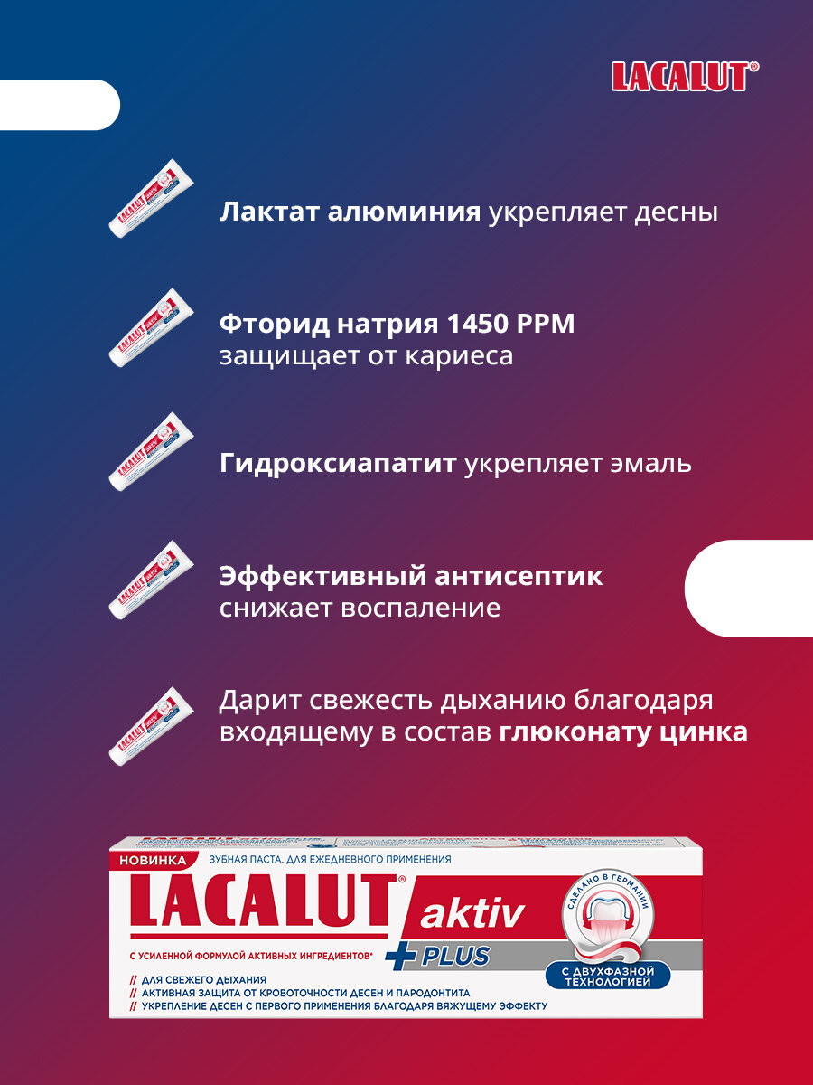 "Специальная зубная паста для профилактики пародонтита и других воспалительных заболеваний десен. Укрепляет десны и предотвращает их кровоточивость. В основе LACALUT® aktiv PLUS уникальная формула LACALUT® aktiv, усиленная гидроксиапатитом и соединением цинка*, которая тщательно заботится о здоровье зубов и десен. Белая фаза тонизирует и укрепляет десны с первого применения**. Гидроксиапатит реминерализует и полирует зубную эмаль. Красная фаза освежает дыхание и предотвращает неприятный запах. *по сравнению с профилактической зубной пастой LACALUT® aktiv **вяжущий эффект"