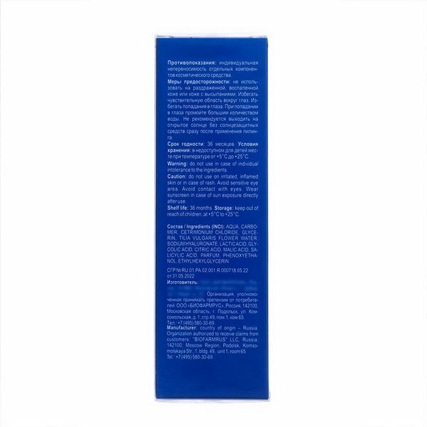 | Состав | AQUA, CARBOMER, CETRIMONIUM CHLORIDE, GLYCERIN, TILIA VULGARIS FLOWER WATER, SODIUM HYALURONATE, LACTIC ACID, GLYCOLIC ACID, CITRIC ACID, MALIC ACID, SALICYLIC ACID, PARFUM, PHENOXYETHANOL, ETHYLHEXYLGLYCERIN |