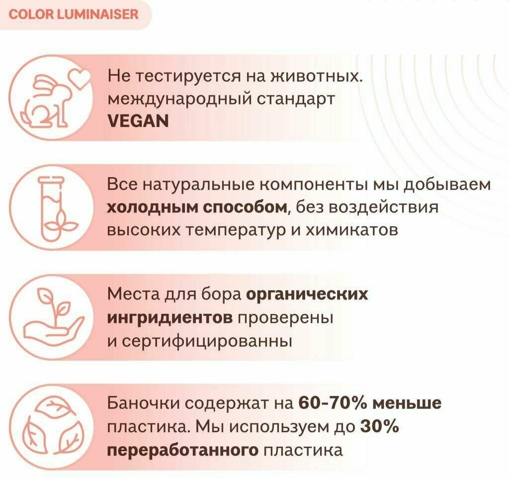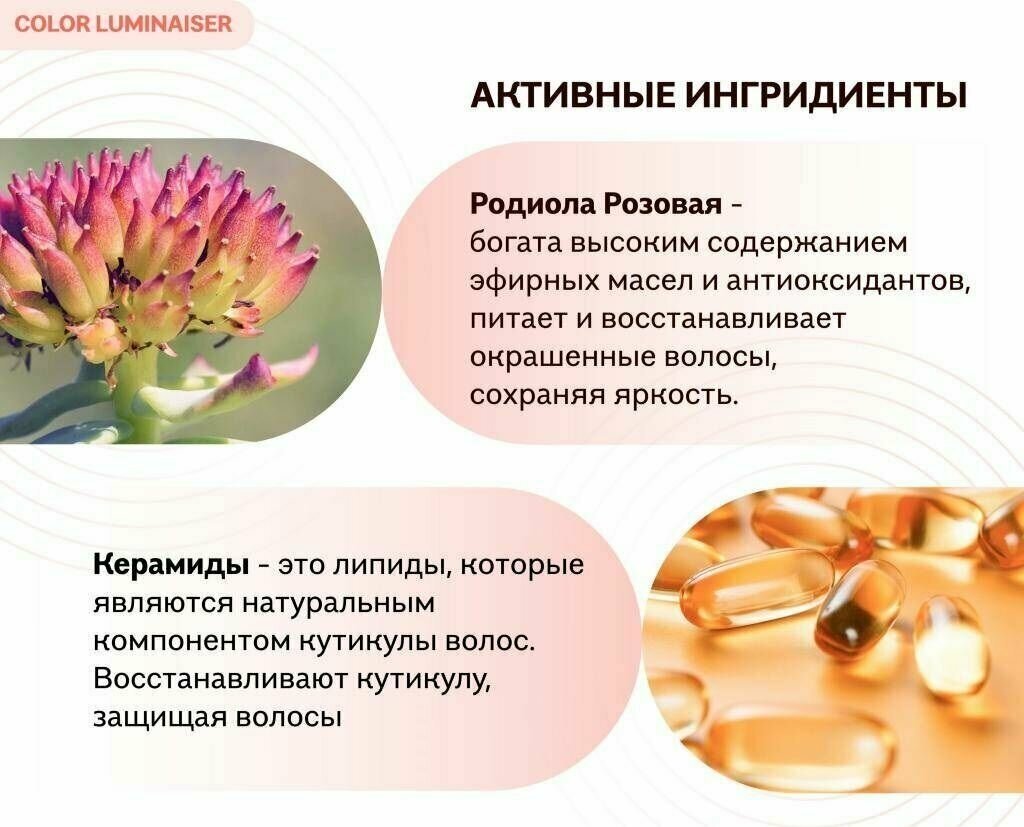 | Состав | aqua, cetrimonium chloride, rhodiola rosea root extractwh (органический экстракт родиолы розовой); phospholipids, комплекс керамидов, fragaria vesca fruit extract* (органический экстракт ягод земляники лесной), vaccinium praestans fruit extractwh (органический экстракт красники курильской), rubus sachalinensis leaf extractwh (органический экстракт малины сахалинской), malva sylvestris flower extract* (органический экстракт цветов мальвы), pelargonium graveolens oil* (органическое масло герани), hesperis sibirica extract* (органический экстракт вечерницы сибирской), tocopherol, уф фильтр, amodimethicone, polysilicone-29, dipropylene glycol, heptyl glucoside, benzyl alcohol, benzoic acid, sorbic acid, parfum, citric acid, coumarin, hexyl cinnamal, linalool, eugenol.(*) – органические ингредиенты. (wh) – органические экстракты дикорастущих растений сибири. |