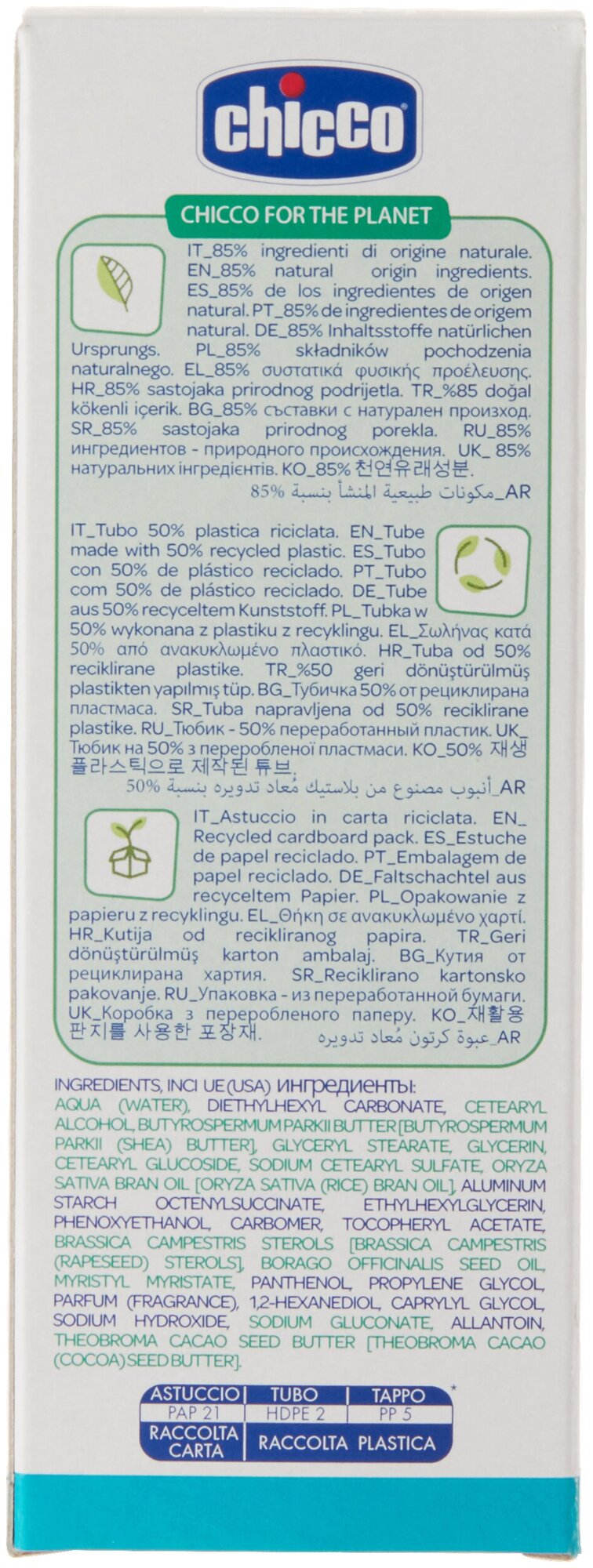 Chicco Baby Moments Детский защитный крем при ветре и непогоде 50 мл Детский защитный крем при ветре и непогоде Chicco Baby Moments защищает кожу малыша в период мороза и непогоды. В состав крема от ветра входит масло какао, которое укрепляет кожный защитный барьер самых маленьких, создавая специальную пленку против неблагоприятных атмосферных явлений, таких как холод, мороз или ветер. Защитный крем предназначен для младенцев с рождения. Способ применения: нанести на кожу лица и рук за 20 минут до выхода на улицу. Объем: 50 мл. Косметика Chicco Baby Moments создана обеспечить бережный, безопасный уход за малышом с самого рождения. Все средства Chicco Baby Moments производятся в Италии, не содержат парабенов, не содержат лаурил- и лауретсульфатов натрия (SLS/SLES), содержат увлажняющие растительные ингредиенты, клинически протестированы для чувствительной кожи и являются гипоаллергенными. Aqua (water), diethylhexyl carbonate, cetearyl alcohol, butyrospermum parkii butter [butyrospermum parkii (shea) butter], glyceryl stearate, glycerin, cetearyl glucoside, sodium cetearyl sulfate, oryza sativa bran oil [oryza sativa (rice) bran oil], aluminum starch octenylsuccinate, ethylhexylglycerin, phenoxyethanol, carbomer, tocopheryl acetate, brassica campestris sterols [brassica campestris (rapeseed) sterols], borago officinalis seed oil, myristyl myristate, panthenol, propylene glycol, parfum (fragrance), 1,2-hexanediol, caprylyl glycol, sodium hydroxide, sodium gluconate, allantoin, theobroma cacao seed butter [theobroma cacao (cocoa) seed butter].