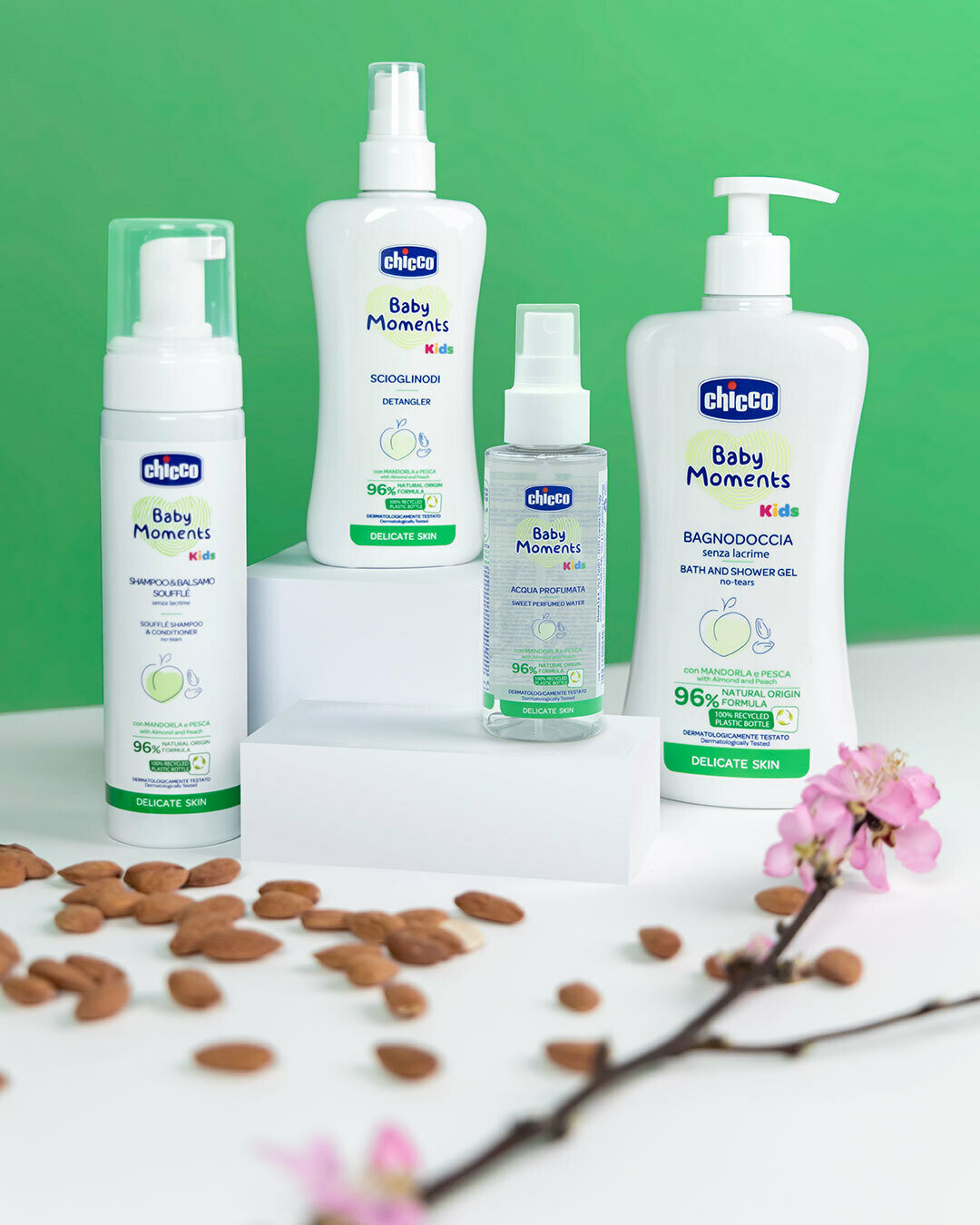 Инновационный детский шампунь-мусс 2 в 1 Chicco Baby Moments с очень приятной текстурой, делающей волосы мягкими и блестящими. Нажмите на дозатор и откройте для себя волшебство!Средство для волос 2 в 1 включает в себя шампунь и кондиционер, состоящий из 96% ингредиентов натурального происхождения, окутывают волосы мягким и ароматным муссом. Формула, обогащенная увлажняющим экстрактом миндаля и освежающим персиком, не раздражает глаза.Шампунь-суфле и кондиционер имеет деликатную формулу, протестированную дерматологами и офтальмологами.Бренд Chicco (Чикко) создан в Италии в 1958 году и уже 60 лет предлагает малышам и их мамам качественные и надежные товары для комфортного материнства.Упаковка средства на 100% состоит из переработанного пищевого пластика и пригодна к повторной переработке.Все средства Chicco Baby Moments производятся в Италии, не содержат парабенов, не содержат лаурил- и лауретсульфатов натрия (SLS/SLES), содержат увлажняющие растительные ингредиенты, клинически протестированы для чувствительной кожи и являются гипоаллергенными.Способ применения и дозировкаНанести достаточное количество мусса на ладонь, смочить и массировать влажные волосы перед ополаскиванием.Для наружного применения.СоставINGREDIENTS INCI UE (USA): AQUA (WATER), DECYL GLUCOSIDE, COCO-GLUCOSIDE, SODIUM LAURYL GLUCOSE CARBOXYLATE, GLYCERIN, LAURYL GLUCOSIDE, PROPANEDIOL, LACTIC ACID, BENZYL ALCOHOL, BETAINE, 1,2-HEXANEDIOL, POLYGLYCERYL-6 CAPRYLATE, POLYGLYCERYL-4 CAPRATE, XANTHAN GUM, GLYCERYL OLEATE, PARFUM (FRAGRANCE), HYDROLYZED RICE PROTEIN, SODIUM BENZOATE, SODIUM GLUCONATE, SODIUM PCA, SODIUM LACTATE, ARGININE, ASPARTIC ACID, PCA, GLYCINE, ALANINE, SERINE, VALINE, PROLINE, THREONINE, ISOLEUCINE, HISTIDINE, PHENYLALANINE, PRUNUS PERSICA FRUIT EXTRACT [PRUNUS PERSICA (PEACH) FRUIT EXTRACT], PRUNUS AMYGDALUS DULCIS FRUIT EXTRACT [PRUNUS AMYGDALUS DULCIS (SWEET ALMOND) FRUIT EXTRACT], MAGNESIUM ALUMINUM SILICATE, CITRIC ACID, POLYQUATERNIUM-7.