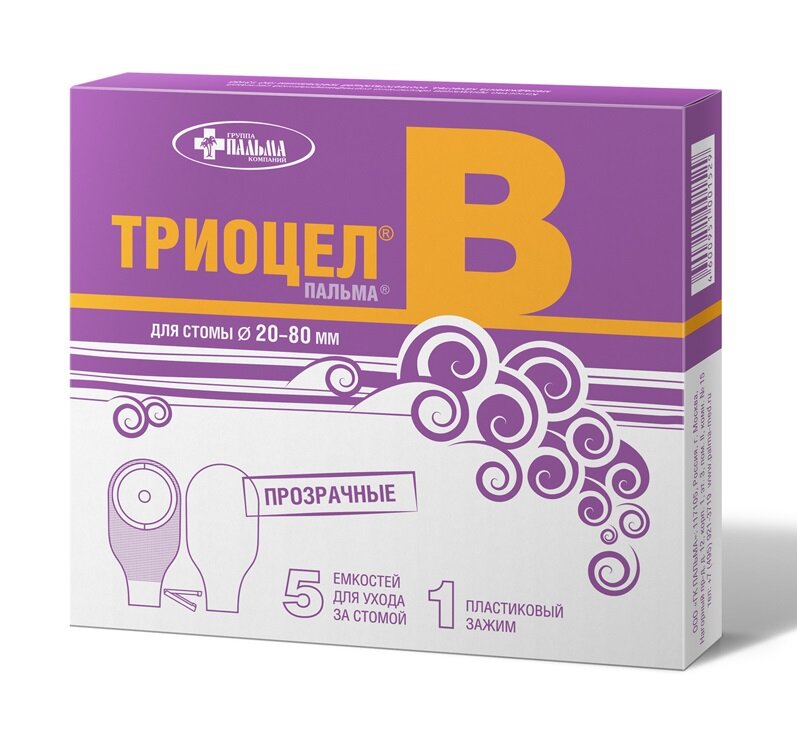 Однокомпонентный калоприёмник Триоцел предназначен для сбора выделений у пациентов с коло- и илеостомой. Изделие состоит из ёмкости, системы крепления и запорного элемента. Ёмкости изготовлены из барьерной многослойной полимерной пленки. Материал плёнки не пропускает запах содержимого ёмкости в течение всего времени использования изделия. Двойная система крепления калоприемников Триоцел, состоящая из фланцевого элемента и герметизирующего адгезивного кольца, позволяет надёжно удерживать емкость на теле пациента и обеспечивает герметичность и отсутствие запаха. Гипоаллергенный материал герметизирующего кольца Триоцел разработан специально для нежной, чувствительной кожи. Именно поэтому с этим материалом выпускаются калоприемники с малым диаметром вырезаемого отверстия, которые могут быть использованы в том числе и для детей. Кроме того, в состав кольца входит альгинат натрия – природный полисахарид, обладающий ранозаживляющими свойствами, и вазелиновое масло, смягчающее и питающее кожу. Особенности: — Бесшумны при ношении; — Незаметны под одеждой; — Используются в течение нескольких дней без снятия со стомы; — Препятствуют подтеканию содержимого калоприёмника и появлению неприятного запаха; — Не вызывают раздражения. Технические характеристики: — Однокомпонентный, дренируемый, прозрачный мешок; — Вырезаемое отверстие 20-80 мм; — Стерильный; — Одноразовый; — В комплекте 5 емкостей, 1 зажим, инструкция.