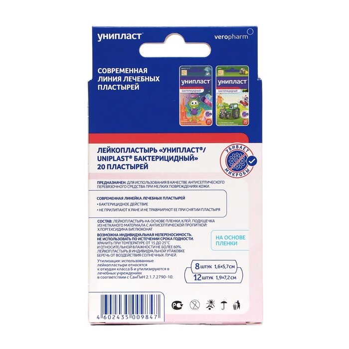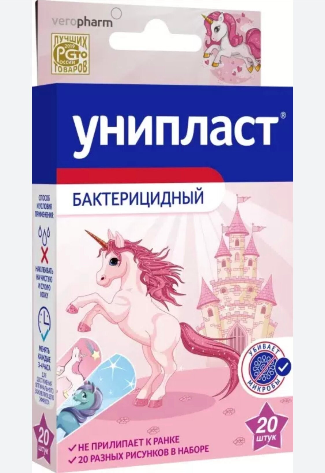 ЛЕЙКОПЛАСТЫРЬ УНИПЛАСТ БАКТЕРИЦИДНЫЙ ЕДИНОРОГИ - представляет собой липкую основу - прозрачную плёнку с прикрепленной к ней прокладкой из нетканого материала, пропитанного раствором хлоргексидина биглюконата, покрытую с липкой стороны защитным покрытием. Унипласт бактерицидный Единороги - современная линейка лечебных пластырей: