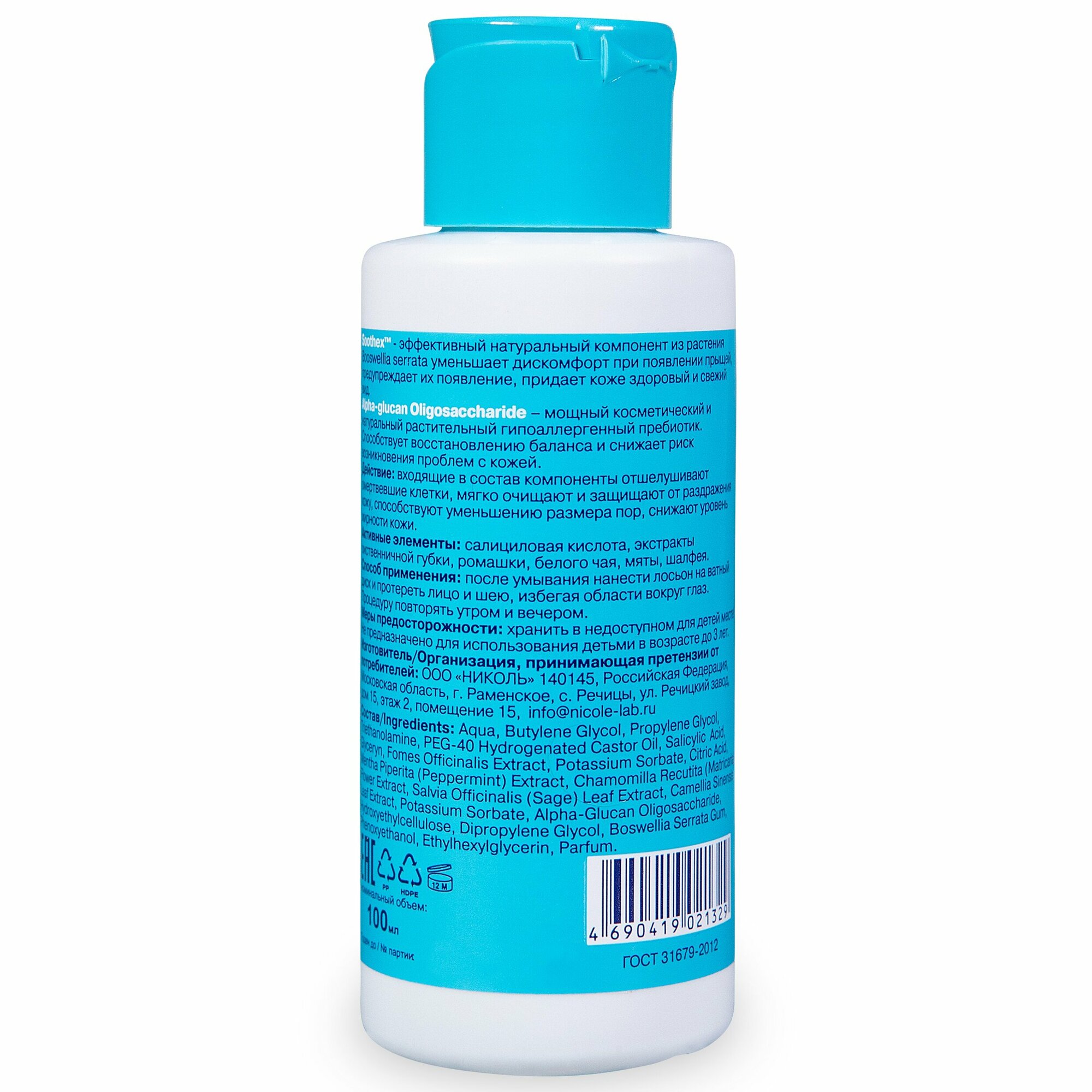 | Состав | aqua, propylene glycol, linum usitatissimum (flax), panicum virgatum (millet), avena sativa (oat) seeds extract, butylene glycol, fomes officinalis (mushroom) extract, camellia sinensis extract, mentha piperita (peppermint) extract, matricaria chamomilla flower extract, calendula officinalis flower extract, dipropylene glycol, boswellia serrata gum, inulin, alpha-glucan oligosaccharide, salicylic acid, allantoin, hydroxyethylcellulose, benzyl alcohol, methylchloroisothiazolinone, methylisothiazolinone, triethanolamine |