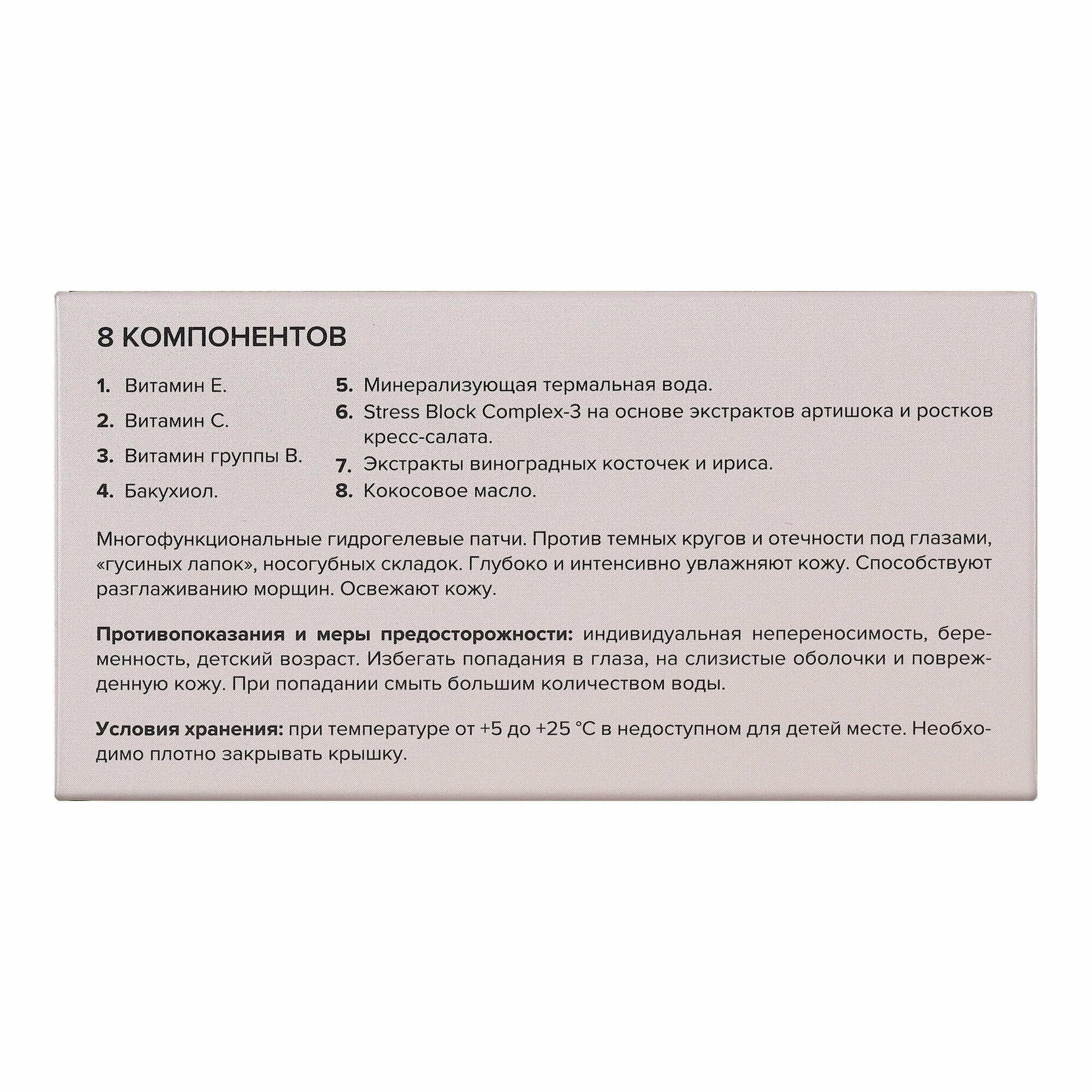Гидрогелевые патчи с витамином Е,С,В подходят для всех типов кожи, в том числе и для чувствительной. Патчи насыщают кожу витаминами и необходимыми микроэлементами, смягчают и разглаживают дерму. Витаимн Е - природный антиоксидант, нейтрализует действие свободных радикалов, разрушающих коллагеновые волокна. За счет этого восстанавливается уровень коллагена в дерме, запускаются регенерирующие процессы, которе приводят к омоложению и восстановлению кожного покрова. Кожа становится более плотной и упругой, улучшаются ее защитные функции. Благодаря этому дерма быстро восстанавливается после механических и повреждений другого рода. Кожа становится менее подвержена внешним воздействиям окружающей среды, таких, низкие температуры, УФ излучения. Также улучшается общее состояние кожи, ускоряются метаболические процессы, укрепляются стенки сосудов и повышается их проходимость. Термальная вода в составе средства помогает устранить вялость и тусклость дермы, придает коже сияние и свежесть. После применения патчей кожа подтянетя, станет более молодой и упругой, исчезнут морщины.