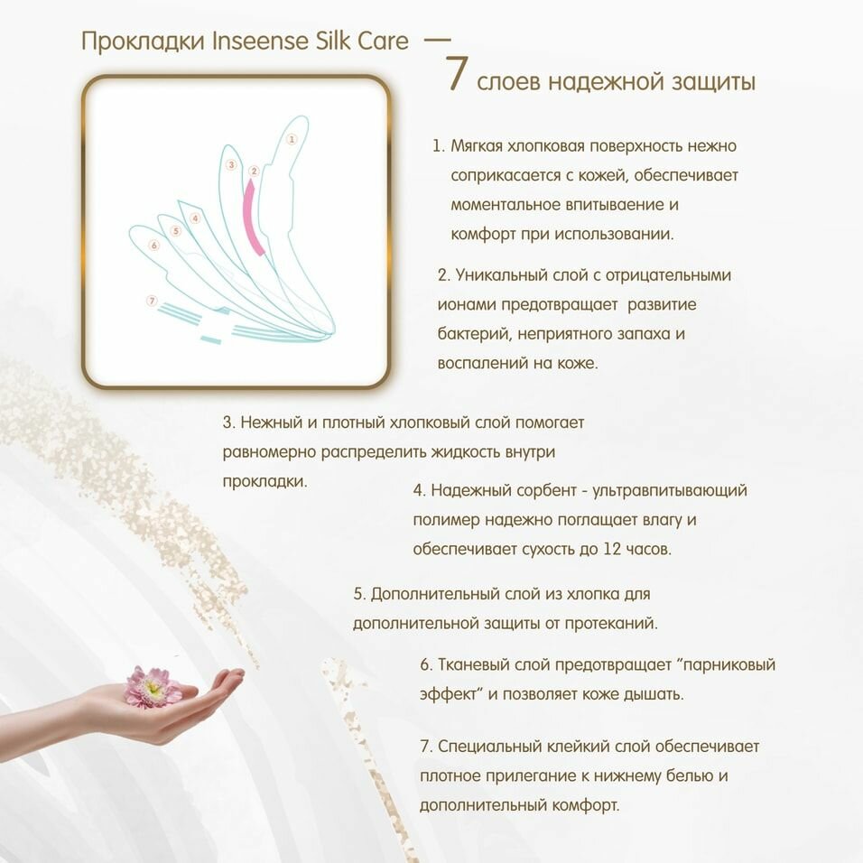 Дышащие гигиенические прокладки Inseense Silk Care созданы для ежедневного использования с заботой и нежностью о женском здоровье. Незаметная дополнительная защита, которую не чувствуешь. Эффективно впитывают незначительные выделения. Ежедневные прокладки Inseense Silk Care:• Созданы по уникальной технологии с Anion chip. Встроенный чип оказывает антибактериальный эффект и нейтрализует неприятные запахи.• Супермягкие ультратонкие прокладки – это свежесть, чистота и комфорт до 12 часов.• Благодаря гибким крылышкам подходят для любых составов ткани и типов нижнего белья. • Изготовлены из высококачественных материалов, обеспечивающих высокий уровень гигиены. Мягкая натуральная пористая поверхность создает дополнительный комфорт и воздухопроницаемость. • Клейкая лента надежно фиксирует прокладку к белью.• Без ароматизаторов. Подходят для чувствительной кожи.• Индивидуальная упаковка каждой прокладки обеспечивает абсолютную гигиеничность.Ежедневные женские гигиенические прокладки Inseense Silk Care дарят чистоту и свежесть на долгое время в любой ситуации. При появлении раздражения прекратите использование. После использования требуется утилизация. Не выбрасывать в унитаз.