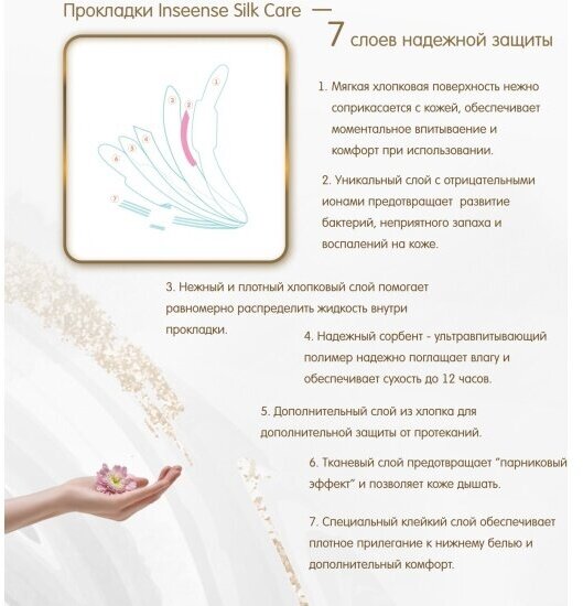 Женские гигиенические прокладки Inseense Silk Care созданы для ночного использования в критические дни с заботой и нежностью о женском здоровье. Обеспечат спокойный и полноценный сон. Идеально подходят для обильных выделений.Ночные прокладки для критических дней Inseense Silk Care изготовлены по уникальной технологии с Anion chip. Встроенный чип оказывает антибактериальный эффект и нейтрализует неприятные запахи.Супермягкие ультратонкие прокладки – это надежная защита и свобода движений в любых ситуациях. Свежесть, чистота, сухость и комфорт до 12 часов.Специальная удлиненная форма ночной прокладки надежно защитит даже в ночное время.Изготовлены из высококачественных материалов, обеспечивающих высокий уровень гигиены. Мягкая натуральная пористая поверхность создает дополнительный комфорт и воздухопроницаемость. Усиленный внутренний слой мгновенно впитывает и удерживает жидкость внутри. Клейкая лента надежно фиксирует прокладку к белью.Способствуют снижению неприятных ощущений и возможного риска возникновения раздражений. Подходят для чувствительной кожи.Без ароматизаторов. Индивидуальная упаковка каждой прокладки обеспечивает абсолютную гигиеничность.Выбирайте надежную защиту с прокладками Inseense Silk Care, ориентируясь на интенсивность выделений.