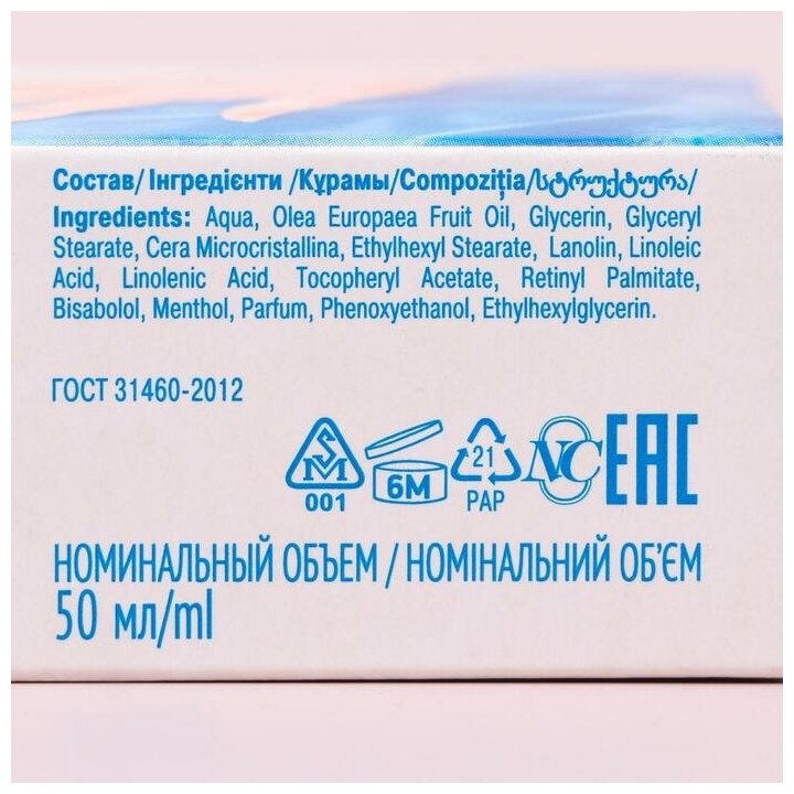 Крем прекрасно питает и смягчает кожу. Он содержит натуральный ланолин, натуральное оливковое масло, альфа-бисаболол и комплекс витаминов А, Е, F. Активные компоненты устраняют чувство стянутости, сухость и шероховатость кожи, придают ей гладкость, улучшают её барьерную функцию. Крем легко распределяется по коже и быстро впитывается, не оставляя чувства липкости.активные компонентыАльфа-бисаболол (активный ингредиент медицинской ромашки) эффективно снимает раздражения и воспаления, оказывает эпителизирующее действие.Оливковое масло обладает отличными смягчающими и питательными свойствами, эффективно восстанавливает гидролипидный барьер кожи.Витамин А ускоряет и усиливает обменные процессы в клетках кожи, способствует обновлению клеток, снимает шелушение и излишнюю сухость, улучшает структуру эпидермисаВитамин Е (витамин молодости) — природный антиоксидант, оказывает защитное действие (защищает клетки от повреждений, вызванных УФ-светом и загрязнением окружающей среды), обеспечивает гладкость кожи и увеличивает ее способность удерживать влагу. Предупреждает преждевременное старение.Витамин F способствует увлажнению кожи, питает ее, усиливает регенерационную способность эпидермиса.Ментол охлаждает кожу, уменьшает чувство усталости, создаёт ощущение комфорта.Ланолин — натуральный жир, предохраняет кожу от обезжиривания и придает ей мягкость и эластичность.